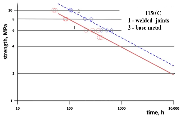 shows the long-term strength curves of welded joints of tubes and base metal at a temperature of 1150 °C. Straight lines are an approximation of the experimental data by a power dependence. The equations for the weld metal (1) and (2) for the base metal are an analytical approximation of the experimental dependences. (