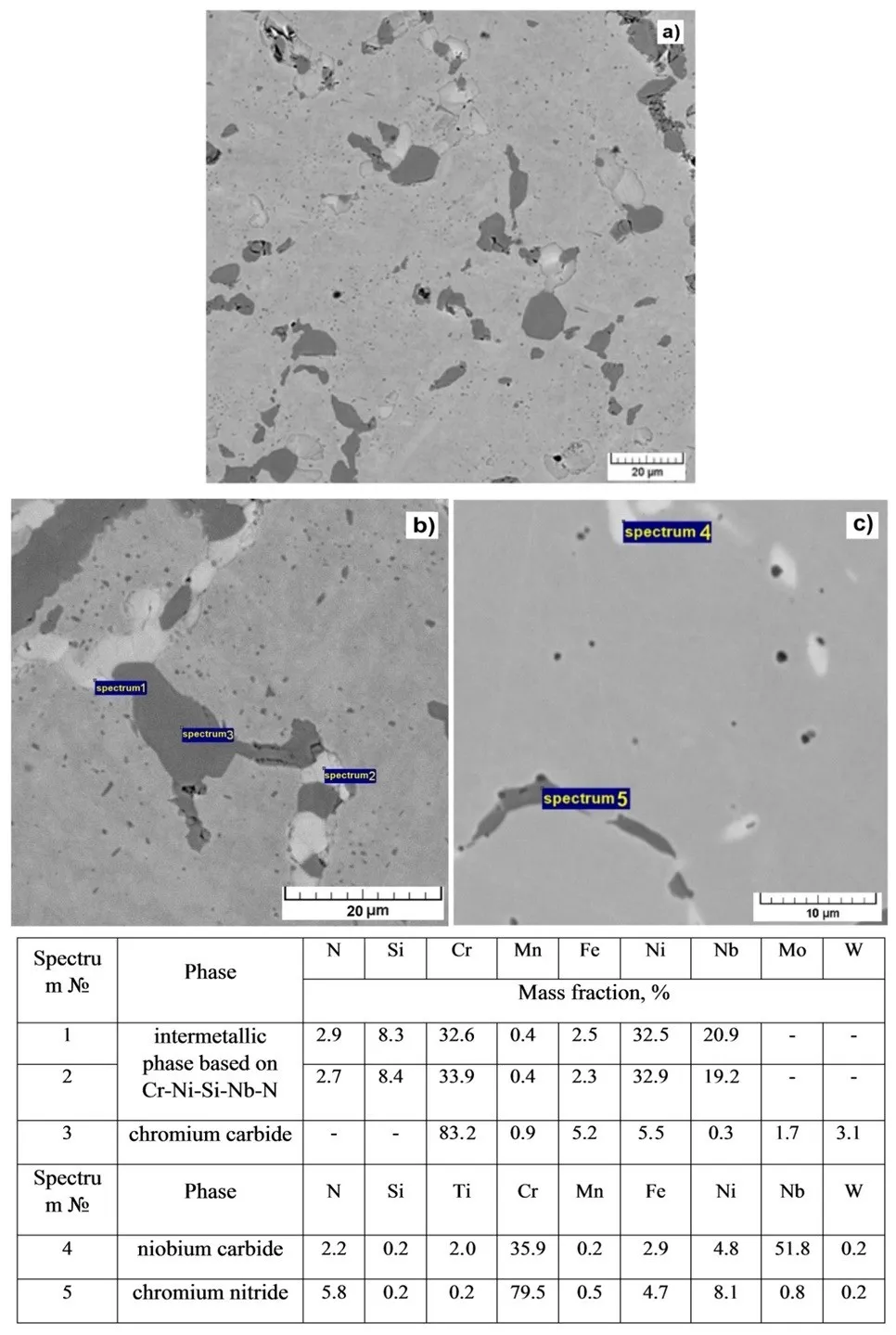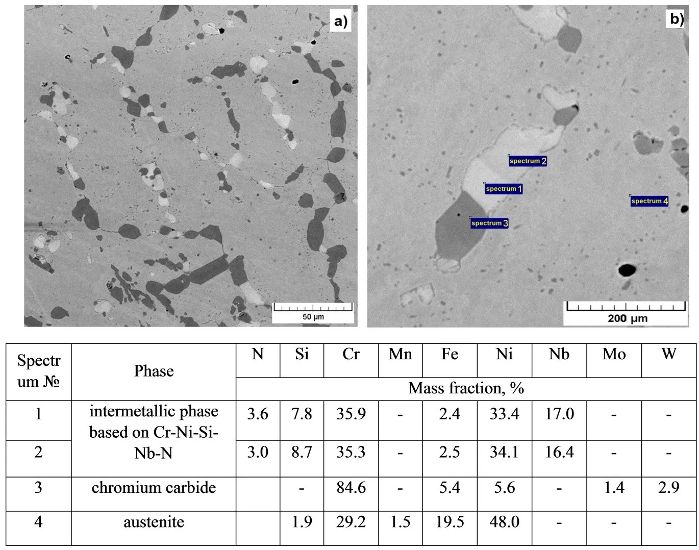 3]. During long-term strength tests, the predominant fracture of samples was recorded in the heat-affected zone (HAZ) near the fusion boundary. Analysis of changes in phase composition revealed a significant increase in nitrogen-containing phases in the HAZ. It is established that both in the base metal and in the welded joint, there is an almost complete transformation of niobium carbide into an intermetallic compound based on Cr-Ni-Si-Nb-N under the influence of atmospheric nitrogen penetrating the metal. The negative effect of nitrogen penetration on the heat resistance of the base metal at a temperature of 1100 due to the depletion of the solid solution of austenite during the formation of chromium carbonitrides has already been noted in [