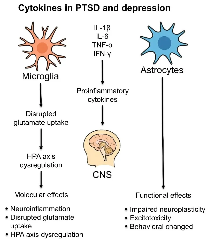 Cytokines are small, secreted proteins that orchestrate immune responses and mediate communication between immune and neural systems. They are broadly categorized into pro-inflammatory (e.g, IL-1β, IL-6, TNF-α) and anti-inflammatory (e.g, IL-10) types. Under chronic stress, sustained production of pro-inflammatory cytokines can disrupt homeostatic brain-immune interactions, contributing to synaptic remodeling, hippocampal atrophy, altered neurotransmission, and dysregulation of the hypothalamic-pituitary-adrenal (HPA) axis. These neurobiological alterations are implicated in core symptoms of PTSD and MDD, such as anhedonia, hyperarousal, and cognitive impairment.
