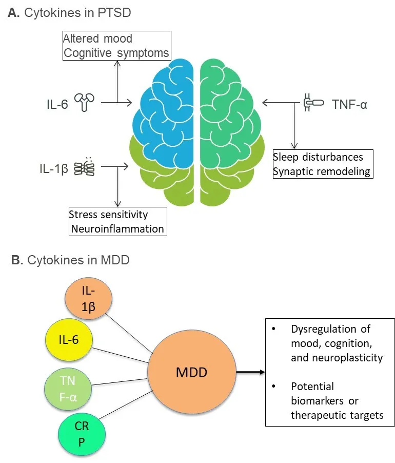 Post-traumatic stress disorder (PTSD) and major depressive disorder (MDD) are prevalent and often comorbid psychiatric conditions characterized by emotional, cognitive, and somatic symptoms. Despite differences in etiology—trauma exposure for PTSD and a broader range of psychosocial factors for MDD—both disorders share overlapping pathophysiological features, including dysregulated stress responses, impaired neuroplasticity, and heightened systemic inflammation. In recent years, increasing attention has been directed toward immune dysregulation—particularly cytokine-mediated signaling—as a central contributor to the onset and maintenance of both PTSD and MDD [