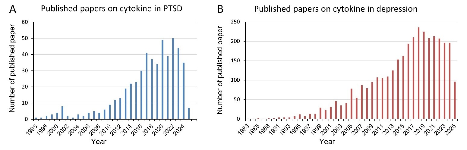 Searched in PubMed using the keywords ‘cytokine and PTSD’ and ‘cytokine and depressive disorder’, we found that there are 440 and 2884 published papers on PTSD and on depressive disorder by 29 April 2025, respectively, showing that cytokines in PTSD and MDD draw more interest over time ().