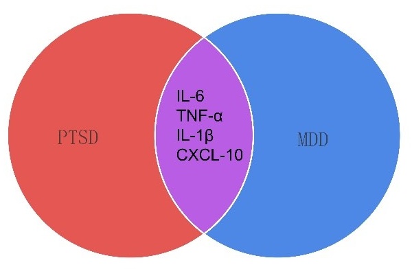 . Shared and distinct inflammatory profiles in PTSD and MDD. Venn diagram illustrating the overlap in immune dysregulation between post-traumatic stress disorder (PTSD) and major depressive disorder (MDD). Both disorders exhibit shared immune signatures, including elevated pro-inflammatory cytokines such as IL-6, IL-1β, and TNF-α. These overlapping inflammatory markers suggest a common pathophysiological mechanism underlying stress-related psychiatric conditions. Disorder-specific immune patterns may also exist, but are not depicted here.