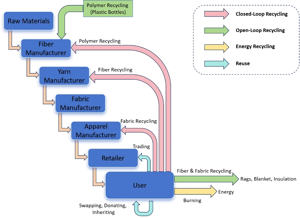 19]. In addition, the construction of a perfect recycling system can help promote the development of a circular economy and improve the sustainability of the textile industry. Meanwhile, policies and regulations also provide impetus for the recycling of fiber materials. For example, the Waste Framework Directive (EU) 2018/851 of the European Union [