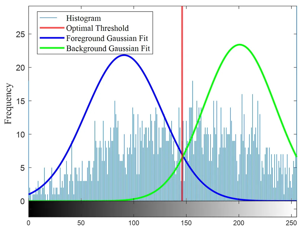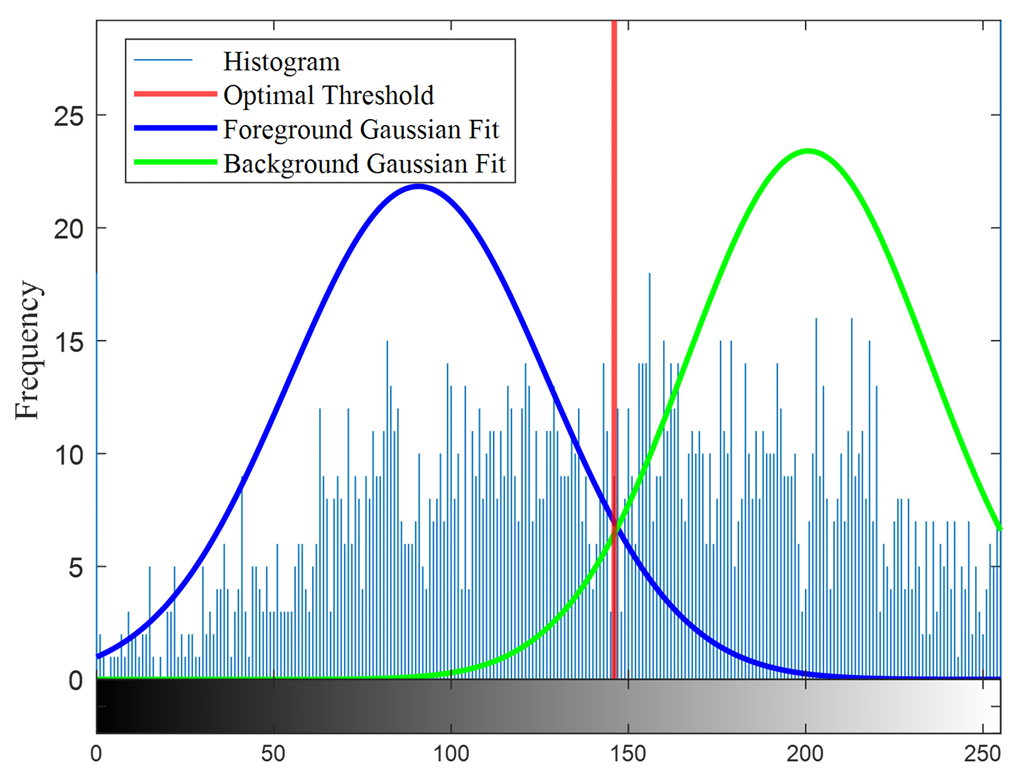 Furthermore, salt deposits and gridlines tend to exhibit high grayscale intensities, especially under strong or uneven illumination. This results in overlapping peaks in the global grayscale histogram—forming a bimodal distribution with low inter-class separability. Consequently, traditional thresholding methods struggle to accurately separate the two, often misclassifying gridlines as salt or vice versa, as schematically represented in .
