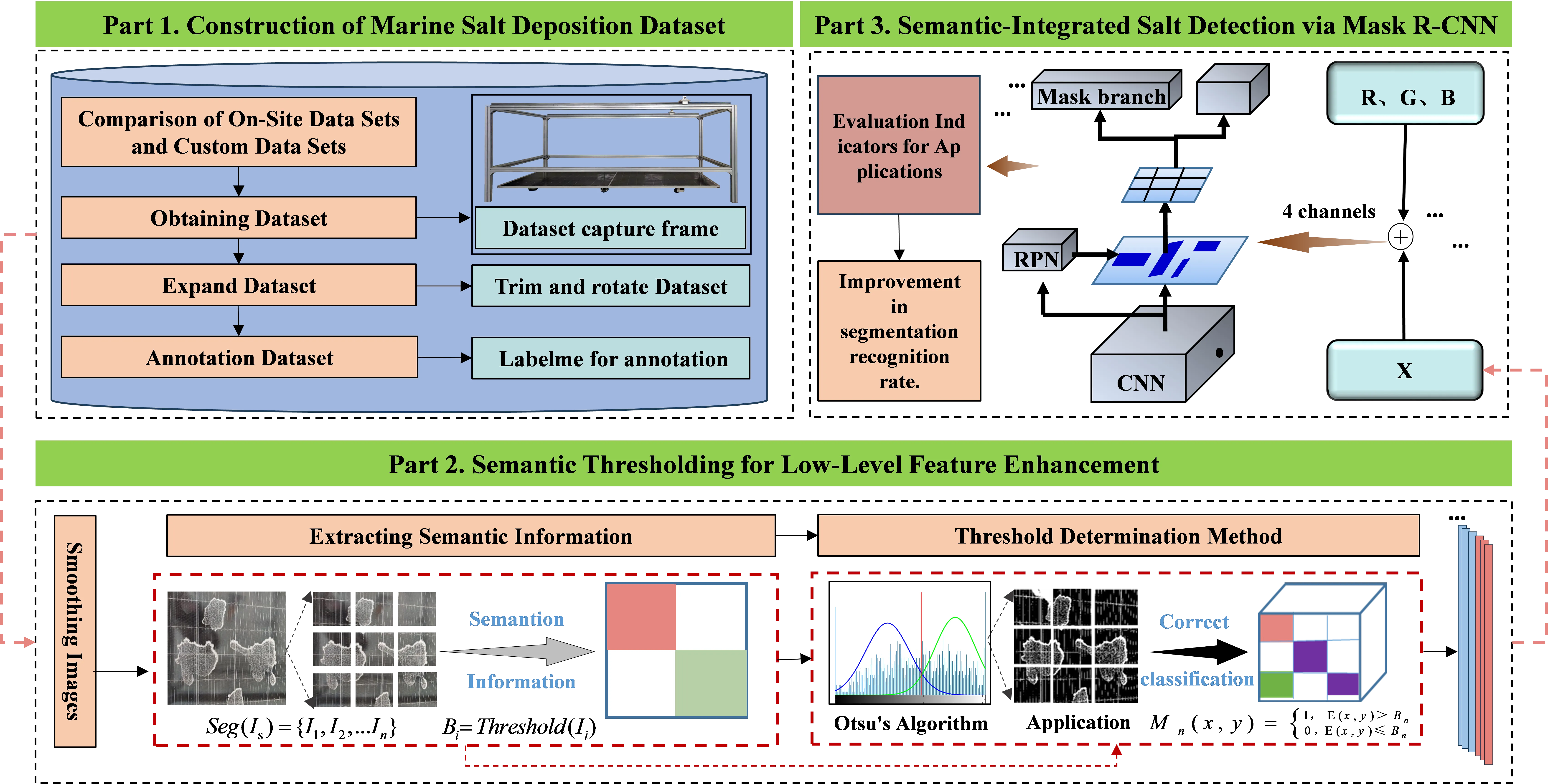This study proposes a semantic information-guided recognition framework to tackle the unique challenges of salt crystallization detection on offshore floating PV modules—particularly the visual interference caused by surface grid lines. The methodology is structured into three sequential stages: (1) construction of a marine salt deposition dataset, (2) semantic thresholding for low-level feature enhancement, in the output, the red area represents the salt analysis zone, the green area represents the surface of the photovoltaic module, and the purple area represents the grid lines of the module, and (3) semantic-integrated salt detection via Mask R-CNN, as illustrated in . Each stage is designed to improve the model’s capacity for accurate and robust salt deposition recognition in complex marine environments.
