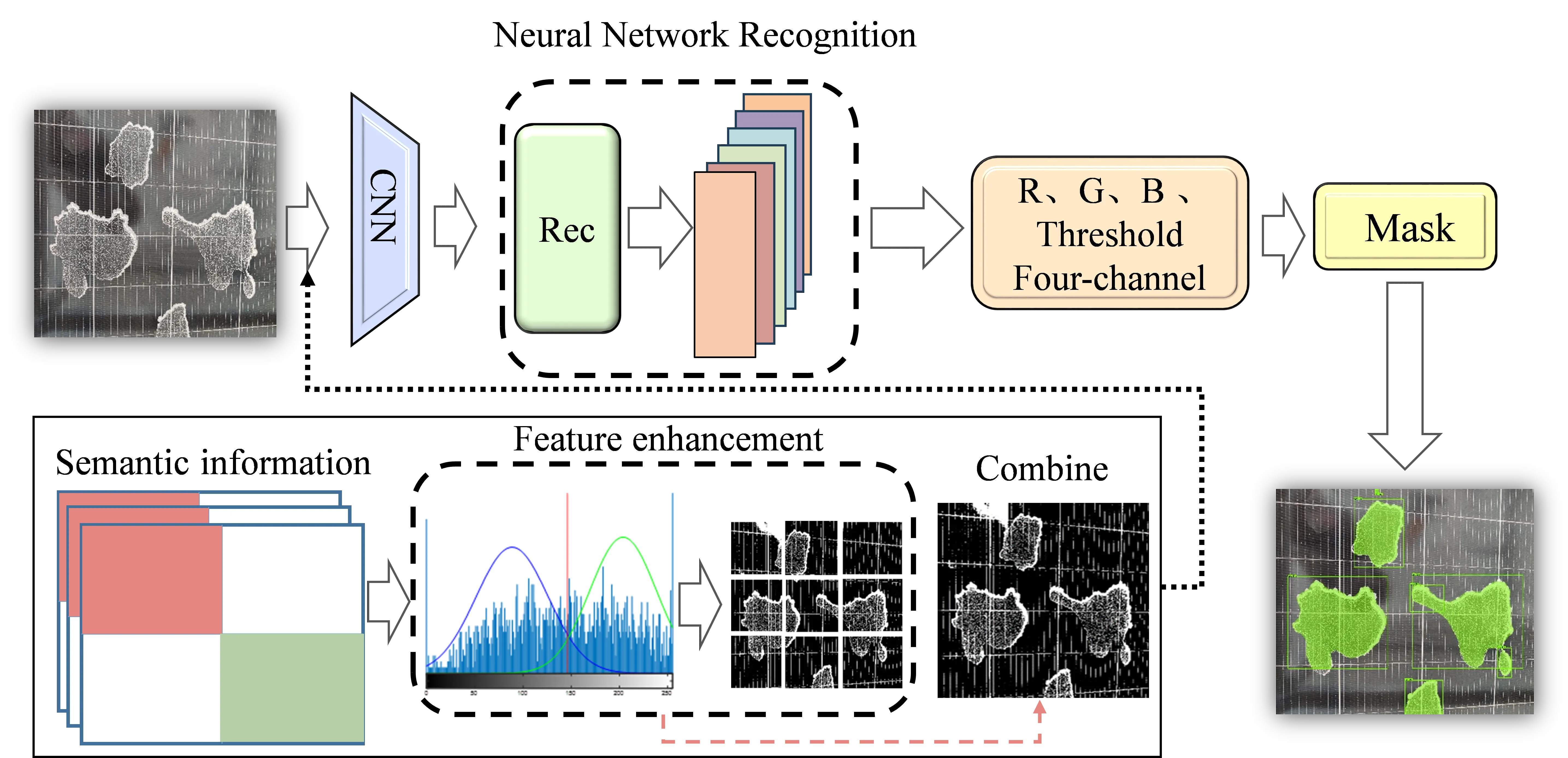 21]. This design leads to two main types of misclassification challenges for traditional Mask R-CNN models: Firstly, the regular geometric shapes of the grid lines are not effectively distinguished from the random deposition patterns of salt crystals, causing the model to mistakenly identify grid lines as salt deposits. Secondly, the specular reflection properties of the grid line coatings introduce glare and high-light noise in the images, severely affecting feature extraction. These issues result in low completeness of recognition images output during the segmentation and identification process when using Mask R-CNN with input images. There is a lack of in-depth research addressing these challenges in investigating and analyzing them. In addressing the above challenges, this study innovatively introduces semantic information, defined as adaptive thresholds determined through multi-dimensional feature analysis using deep learning models. By calculating optimal thresholds suitable for different local regions, these adaptive thresholds are regarded as prior semantic information for the model. They encompass rich image features and segmentation cues, providing reliable prior knowledge for subsequent network construction [