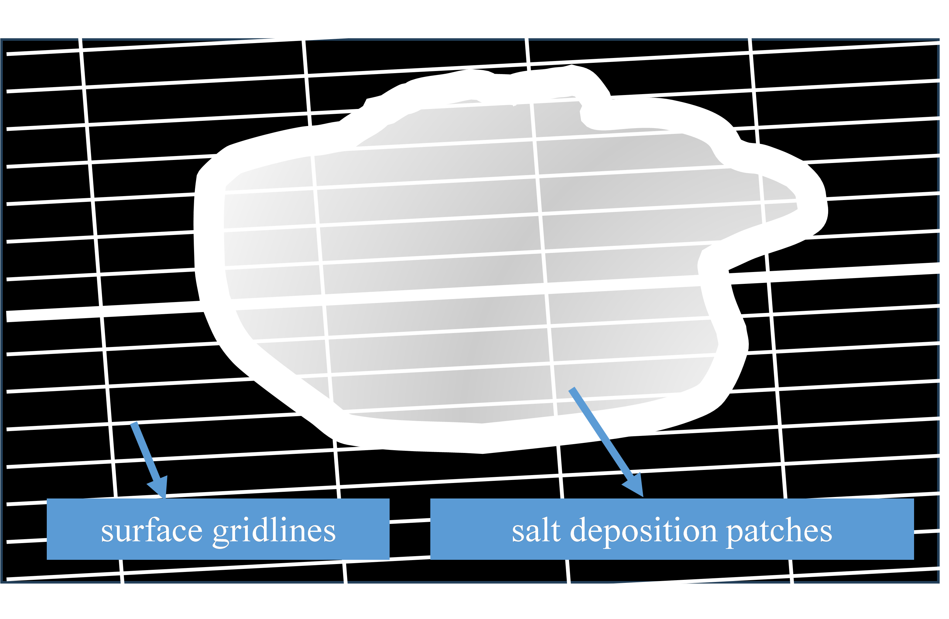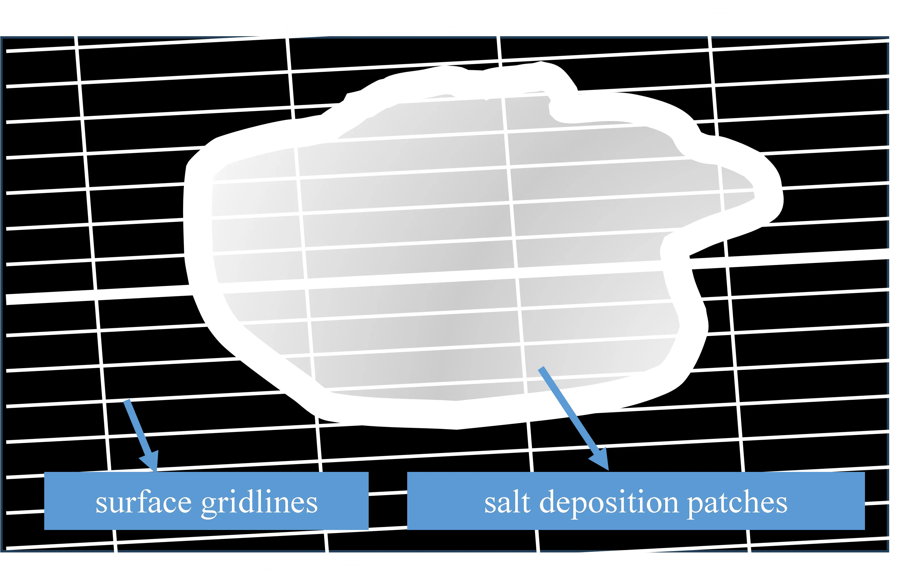 . Surface gridlines and salt deposition patches under the grayscale representation.