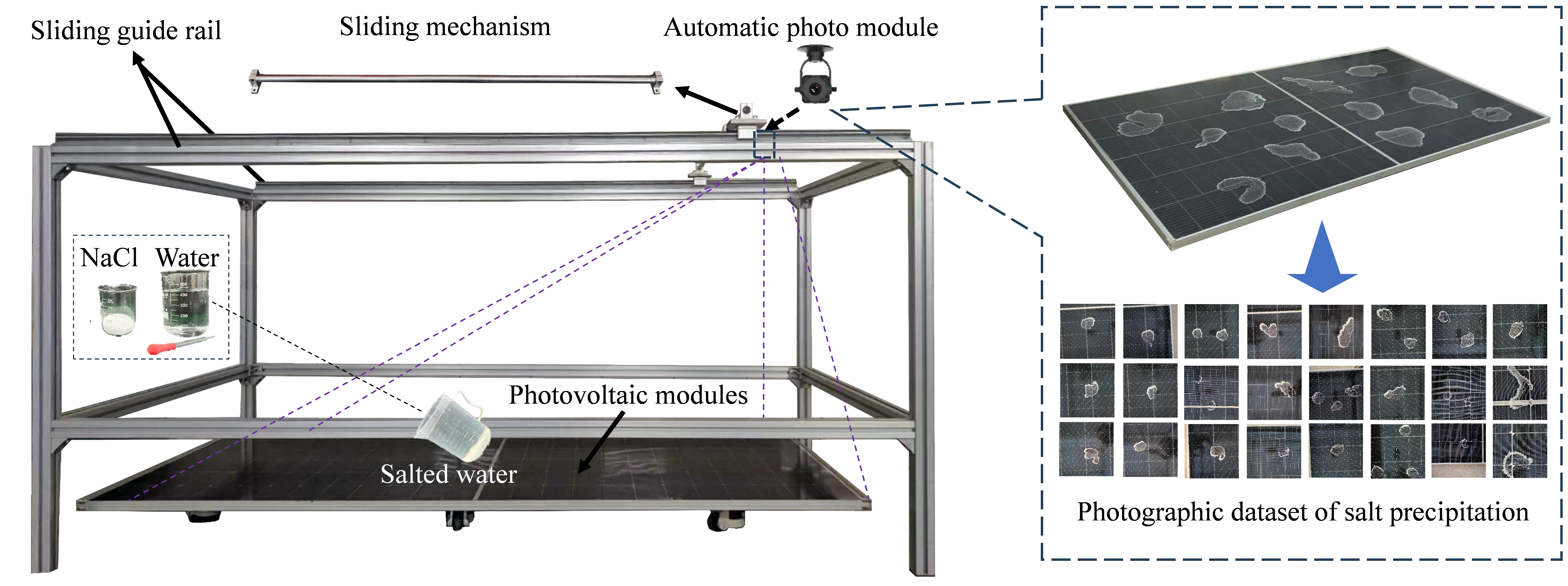 The data acquisition process involved manually simulating salt crystallization on PV module surfaces. A saline solution, prepared to match seawater concentration, was poured evenly over PV surfaces while continuously stirring to ensure consistency. No constraints were imposed on the pouring angle or volume to preserve randomness in deposition patterns. The resulting deposits closely replicated the heterogeneous appearance of actual marine salt crystallization.