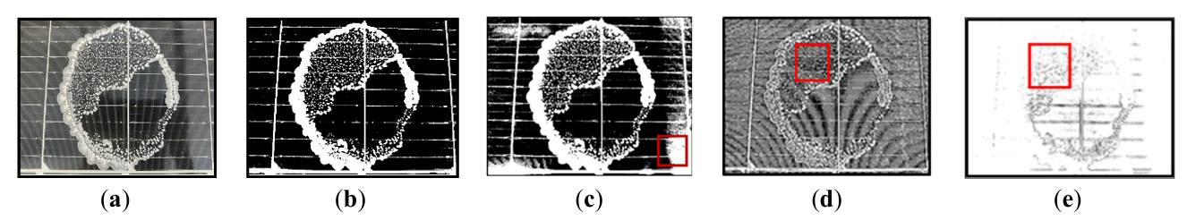 , indicate that Otsu thresholding consistently achieves superior performance in terms of inter-class separability and segmentation clarity, the red box identifies the noise in the algorithm’s output image that impacts the final model’s output. Otsu’s method determines the threshold by maximizing the between-class variance, which effectively enhances contrast between salt efflorescence and the PV module surface even in cases of grayscale ambiguity.
