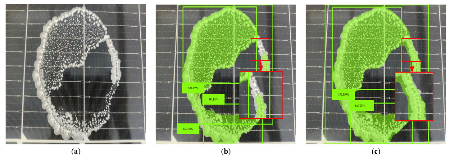 A complete and well-annotated dataset is essential for training robust and generalizable models for salt crystallization detection in offshore PV systems. The variability in salt morphology, lighting conditions, and background interference—such as grid lines—requires diverse and high-quality image data to ensure the detection model can adapt to real-world scenarios. In this study, the dataset construction process is grounded in practical engineering experience and motivated by real environmental conditions observed in operational marine PV installations. Specifically, this study is based on an actual marine engineering project—the TJUT-U2 floating PV power station, independently developed and deployed by our research team. During long-term operation of this offshore floating PV plant, periodic inspections were conducted using unmanned aerial vehicles (UAVs). The UAV-based visual monitoring system captured high-resolution images of PV modules under different operational and environmental states. These aerial images revealed significant instances of salt crystallization forming on the surfaces of PV panels, particularly along the lower edges and near areas of water splash exposure, as shown in .