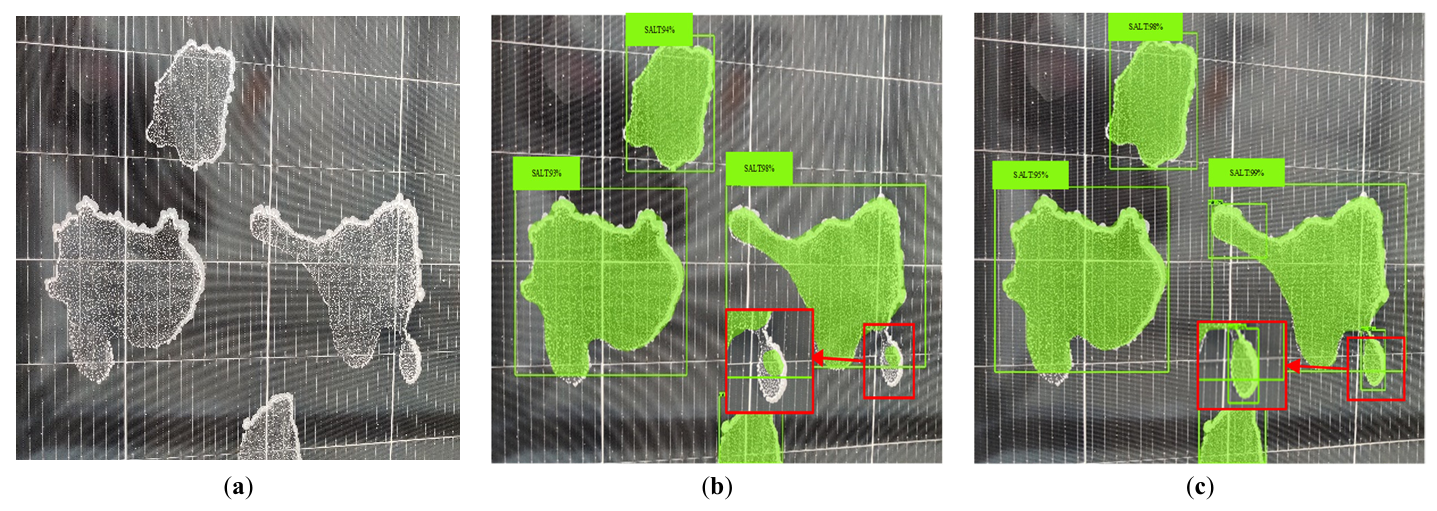 The final stage integrates the semantic information generated from thresholding into an enhanced Mask R-CNN model to perform precise instance-level segmentation of salt deposits. A composite input is constructed by merging the original RGB image with the semantic binary map, forming a four-channel representation that combines both visual and semantic features. The Mask R-CNN architecture is adapted to accommodate this input structure, allowing the network to leverage semantic guidance during training. This integration significantly boosts the model’s performance, resulting in a notable improvement in segmentation recognition rate, especially in complex backgrounds where salt deposits are difficult to distinguish. A series of evaluation indicators for applications is used to assess practical performance. Experimental results confirm that the semantic-enhanced Mask R-CNN demonstrates superior robustness, generalization, and detection accuracy, validating the framework’s potential for deployment in intelligent offshore PV maintenance systems.
