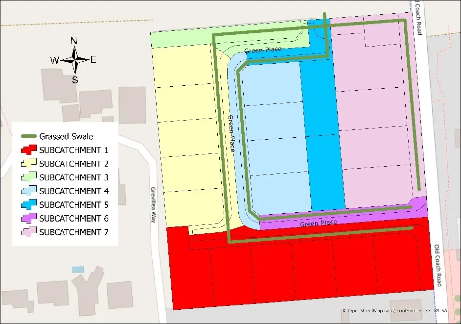 . Sub catchments of the study area indicating location and distribution and of grassy swales.