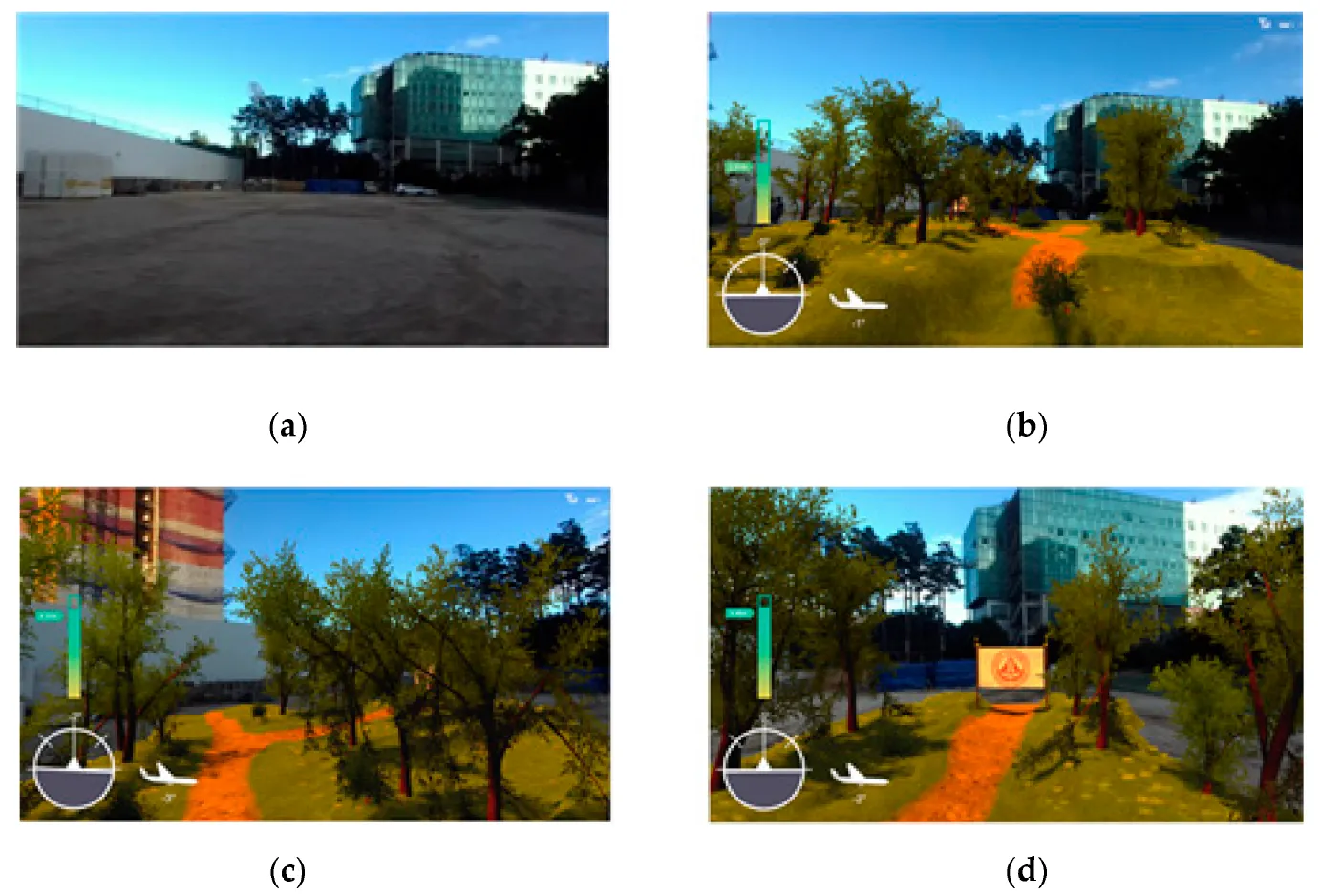 9], ; CC BY 4.0). Panel (<b>a</b>) shows the real-world environment used as a safe baseline for novice users; (<b>b</b>–<b>d</b>) illustrate the synthesized MR forest scenes with a virtual flight path and head-up display elements, demonstrating how physical surroundings are blended with interactive virtual landscapes.