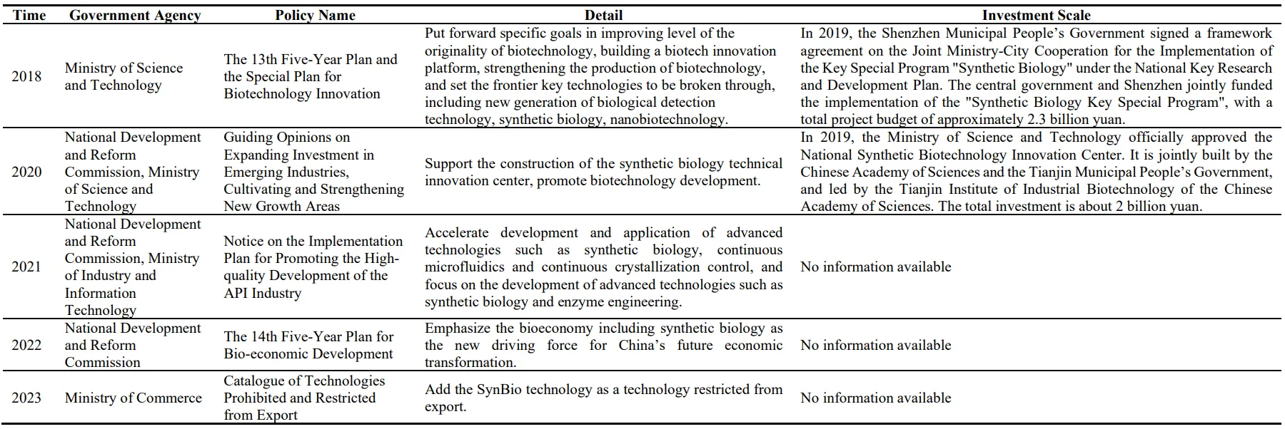 SynBio research has been listed in National High-tech R&D Program of China (Program 863) in 2006 and National Basic Research Program of China (Program 973) since 2010. Policy support accelerates since China’s 13th Five-Year Plan (See Table. 2). For example, the Ministry of Science and Technology initiated a national key R&D program on “synthetic biology” in 2018; in 2020, the government issued Guiding Opinions on Expanding Investment in Strategic Emerging Industries and Cultivating Strengthened New Growth Points and Growth Poles, which supports various regulations, including the establishment of centers for SynBio technology innovation; in 2022, the National Development and Reform Commission released the 14th Five-Year Plan for Bio-economy Development, targeting cutting-edge areas such as synthetic biology, and implementing major national scientific and technological projects and key R&D programs; in 2023, the Ministry of Commerce, together with the Ministry of Science and Technology and other agencies, revised the Catalogue of Technologies Prohibited and Restricted from Export, by adding “synthetic biology technology” as a technology restricted from export. In addition to the national-level initiatives, various provinces and cities throughout China have also introduced synthetic biology-related policies, establishing the planning and support for the growth of this promising industry in the future.