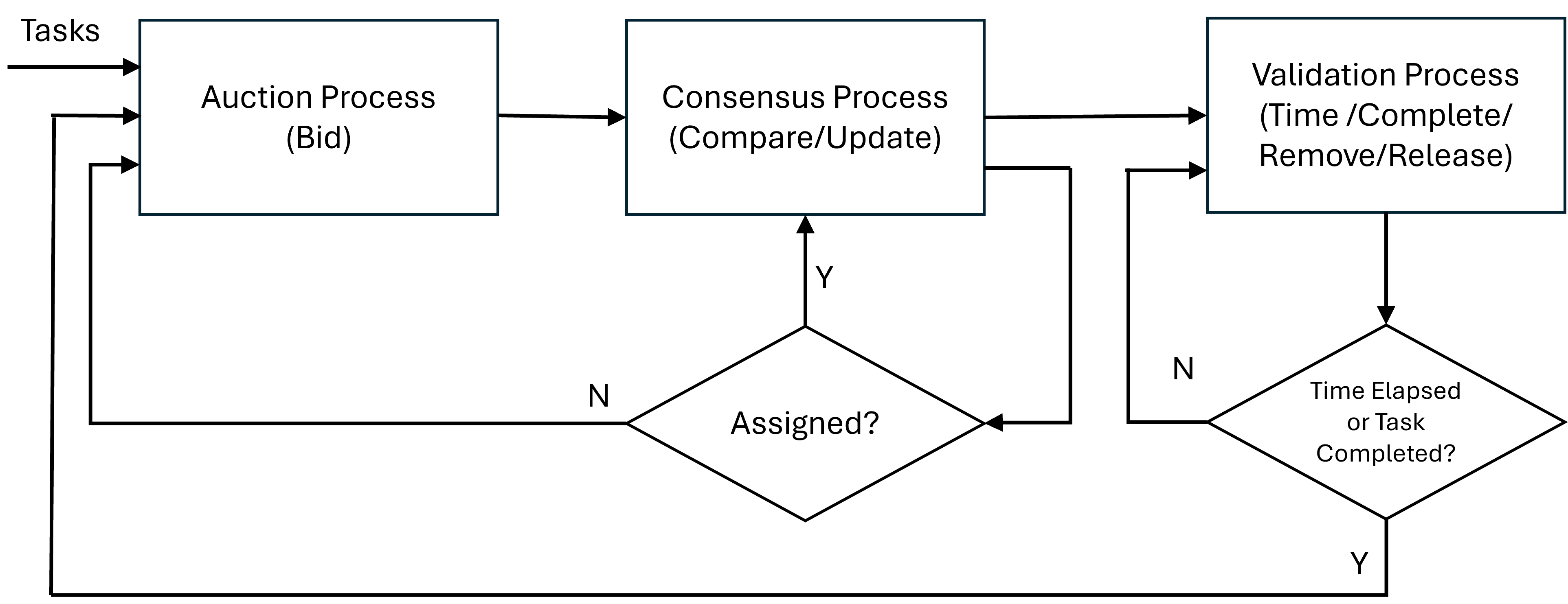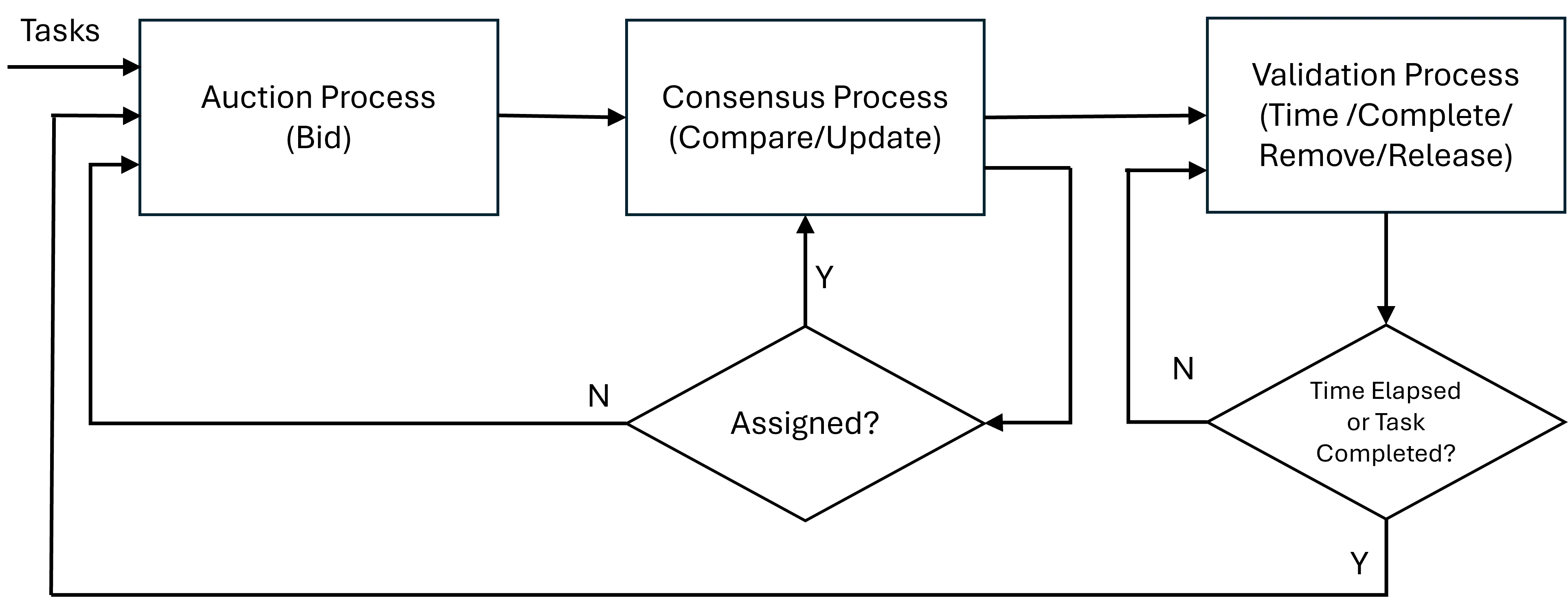35] developed the Consensus-Based Bundle Algorithm (CBBA), a decentralized way to have a fleet of agents “bid” on individual tasks assembled into a bundle for that agent, with assignments made based on the calculated score for each task. This was an extension of an approach first proposed by Alighanbari [
