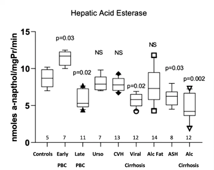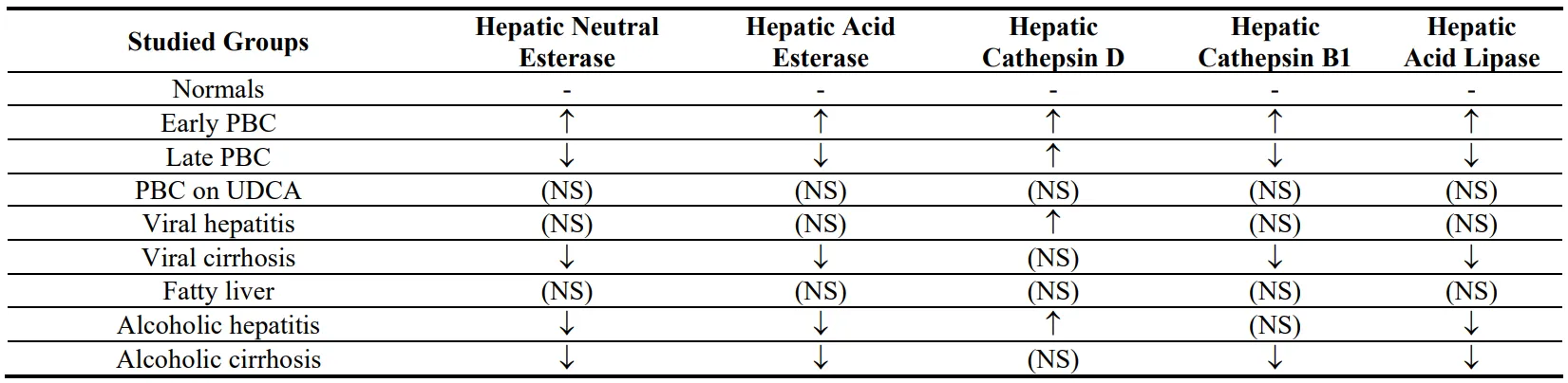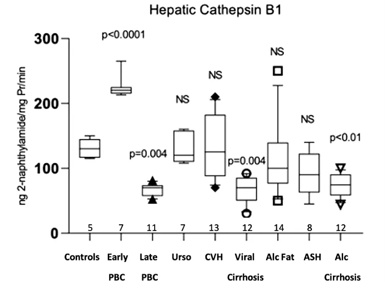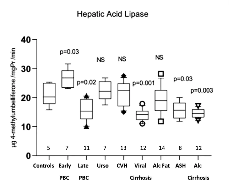 No information exists on the activity of lysosomal enzymes in the liver of PBC patients. On the other hand, autophagy and senescence dysregulation has been proposed as important pathogenetic mechanisms in PBC [