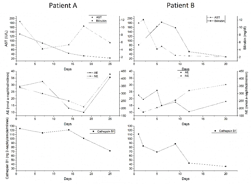 Sequential sera samples from six patients with acute alcoholic hepatitis were used to follow the fluctuations of enzymes according to disease progress. These patients were not on steroids, but antibiotics and supportive enteral nutrition were given.