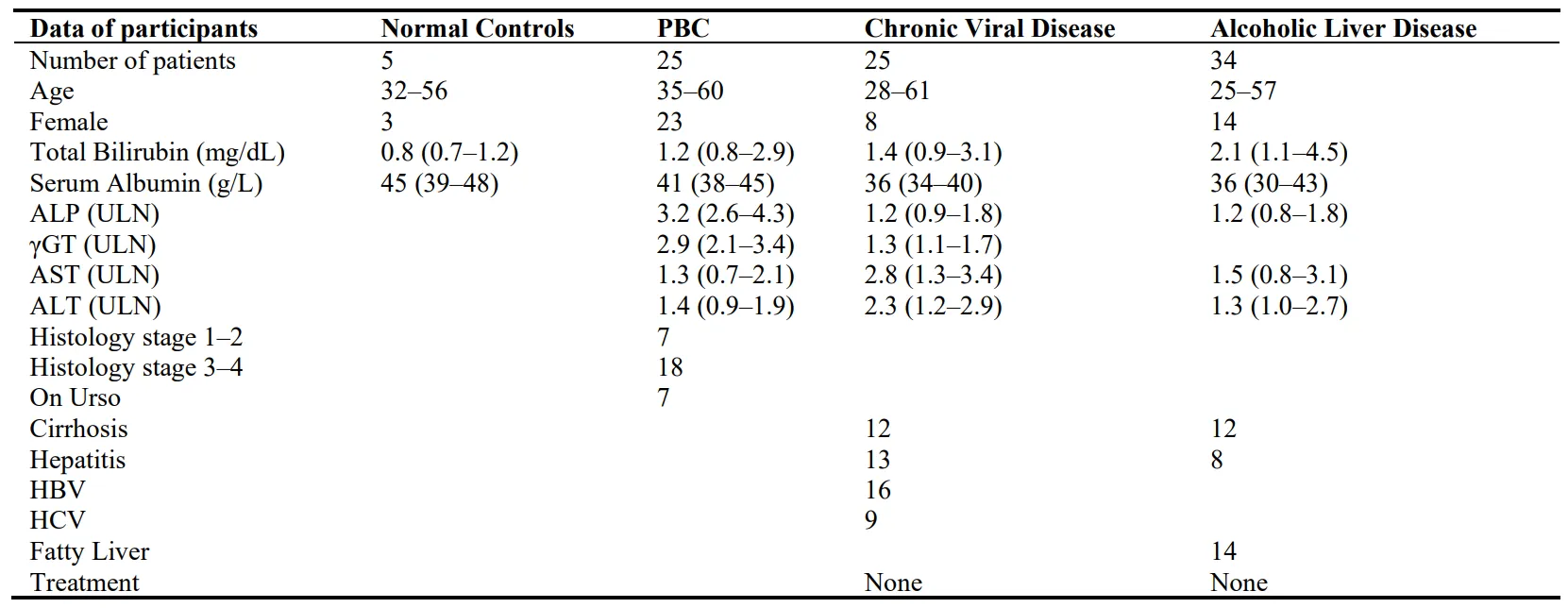 Twenty-five patients (23 females, age 35–60) with PBC, 7 on early stages (I or II), 11 on late stages (III or IV) were classified according to Ludwig [