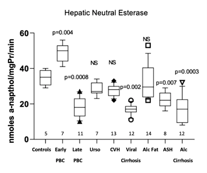 p = 0.0004) compared with normal controls (14.06 ± 2.86). No significant differences were observed in PBC treated with UDCA, viral cirrhosis, fatty liver, and alcoholic cirrhosis (Figure 1).