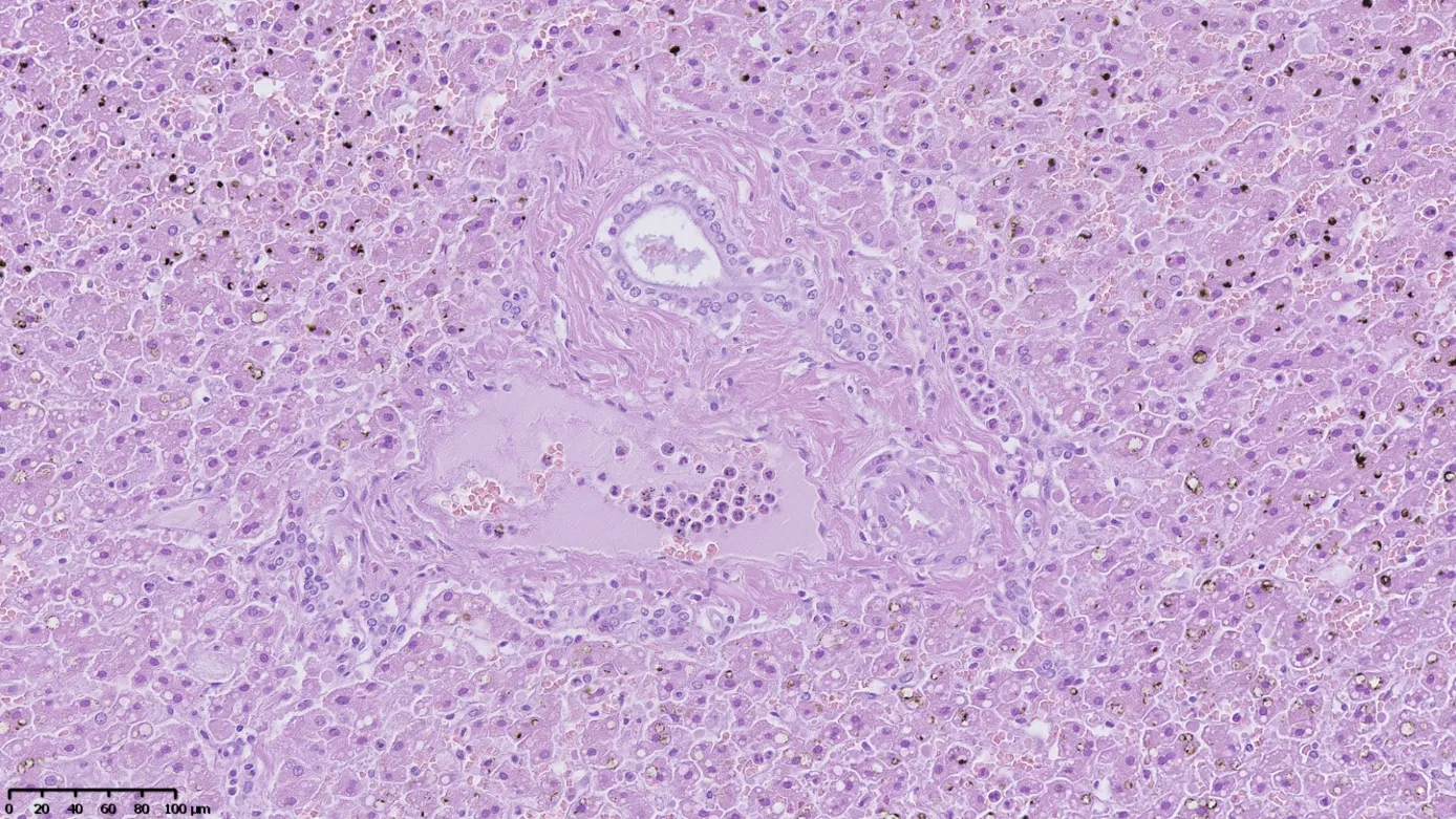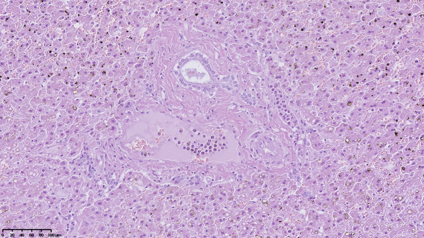 . Numerous neutrophils are visible in the lumen of the venous vessel of the biliary space and in the dilated sinusoidal vessel. There is evidence of mild fibrosis of the biliary space and microvesicular steatosis of the hepatocytes. Numerous yellowish-brown artifacts associated with autolysis are visible in the upper and lower portions of the image. Hematoxilin & eosin stain, magnification ×200.
