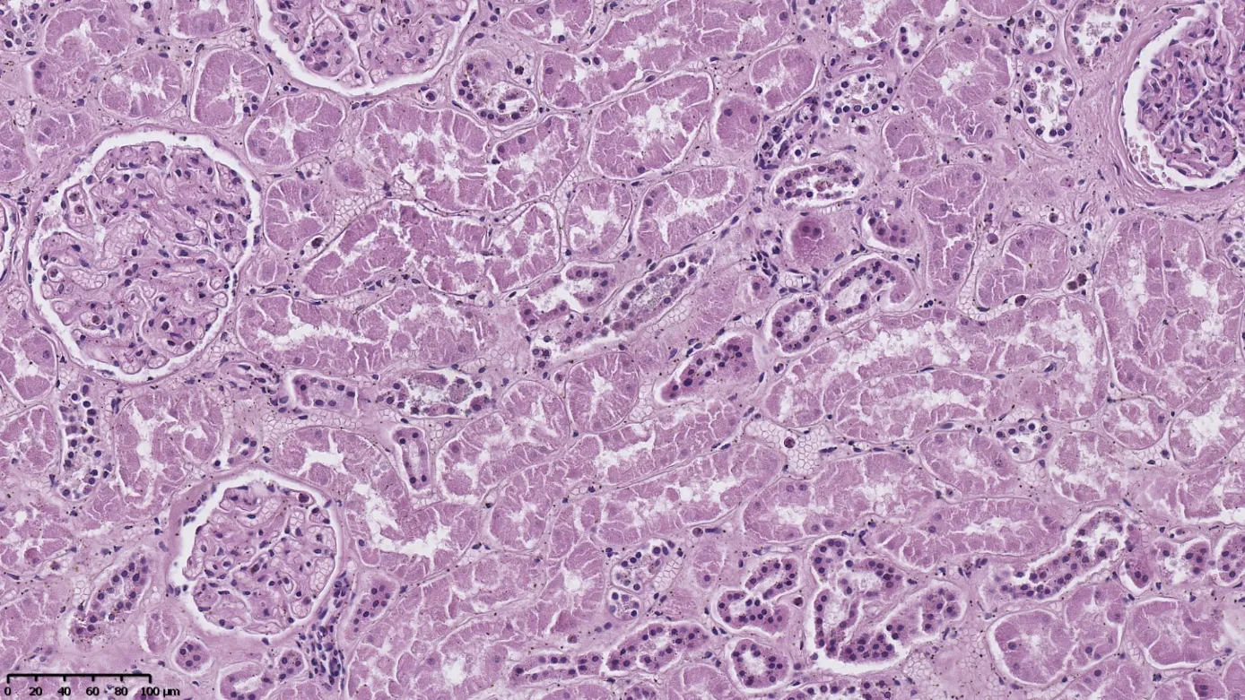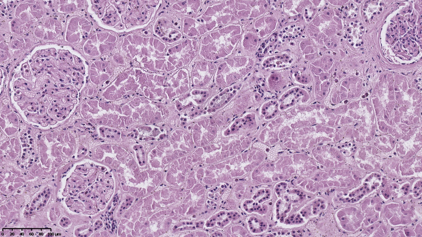 . Features of acute tubular necrosis (ATN). Most of the proximal convoluted tubules demonstrate epithelial cell necrosis with accumulation of debris within the tubular lumen. The epithelium of the distal convoluted tubules and glomeruli is largely intact. Autolytic changes are superimposed on the overall image, often complicating the unambiguous interpretation of the overall image. Hematoxilin & eosin stain, magnification ×200.