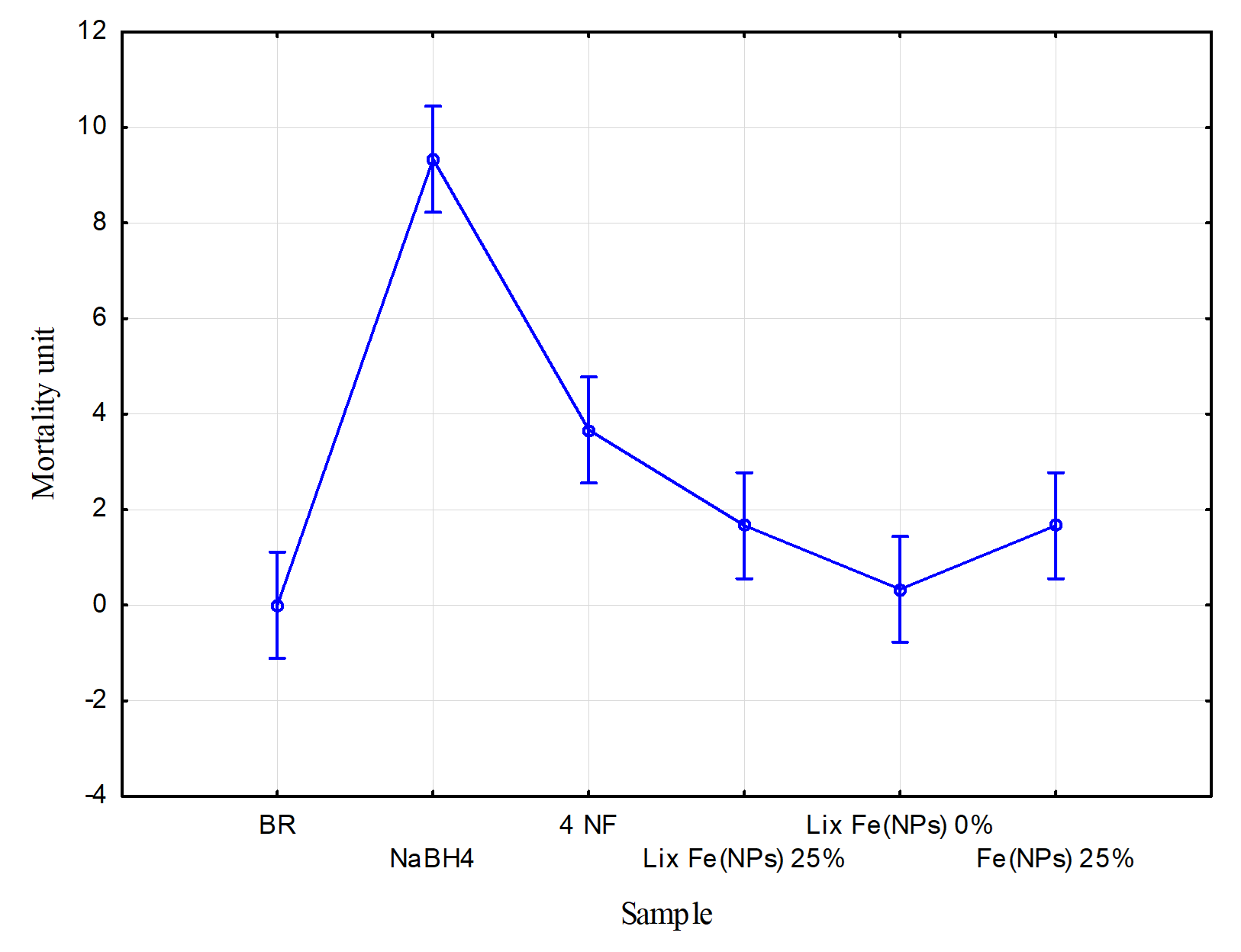 Regarding the leachates, “Lix Fe(NPs) 25%” and “Lix Fe(NPs) 0%”, exhibited average mortalities of approximately 1.75 and 0.25 individuals, respectively, remaining within non-toxic limits [13]. These results suggest that the nanomaterials possess favorable biocompatibility with organisms at this trophic level.