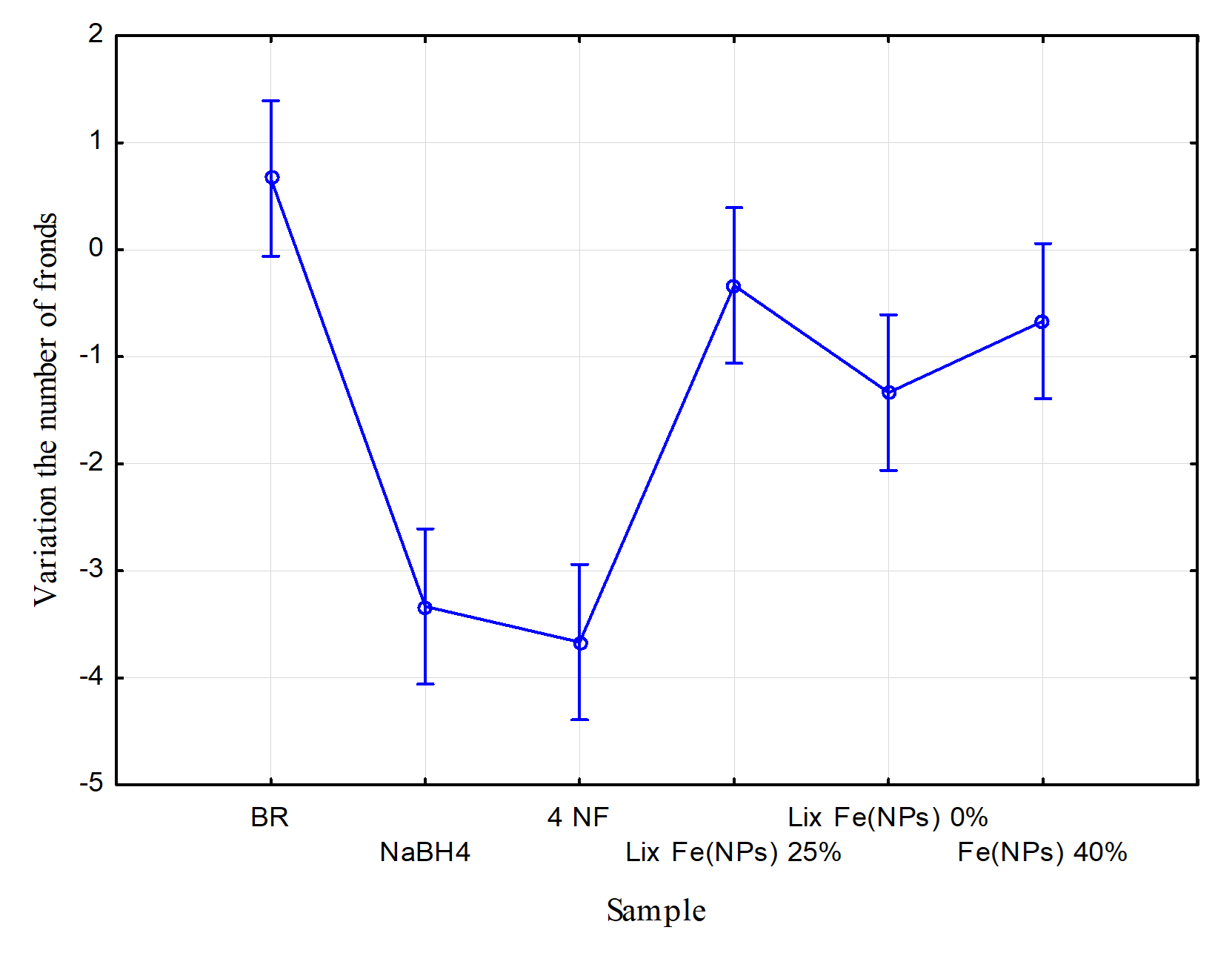 The leachates “Lix Fe(NPs) 25%” and “Lix Fe(NPs) 0%” showed variations of approximately −0.25 and −1.25 fronds, respectively [13]. Therefore, the nanomaterials demonstrated good biocompatibility with aquatic plants at this trophic level.