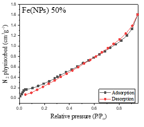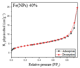 Figure 4 presents the nitrogen adsorption-desorption isotherms of the Fe(NPs). The Fe(NPs) 0% sample, synthesized in previous studies [13], and the Fe(NPs) 40% samples exhibit type IV isotherms with H3-type hysteresis loops, indicating mesoporous structures. These mesoporous isotherms are characterized by slow initial adsorption at low relative pressures, followed by rapid adsorption at higher pressures, suggesting specific interactions between the adsorbate and the internal pore surfaces [13,31,32].
