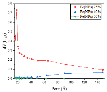 Figure 5. Pore size distributions of the Fe(NPs) samples synthesized with different volumetric proportions of plant extract.