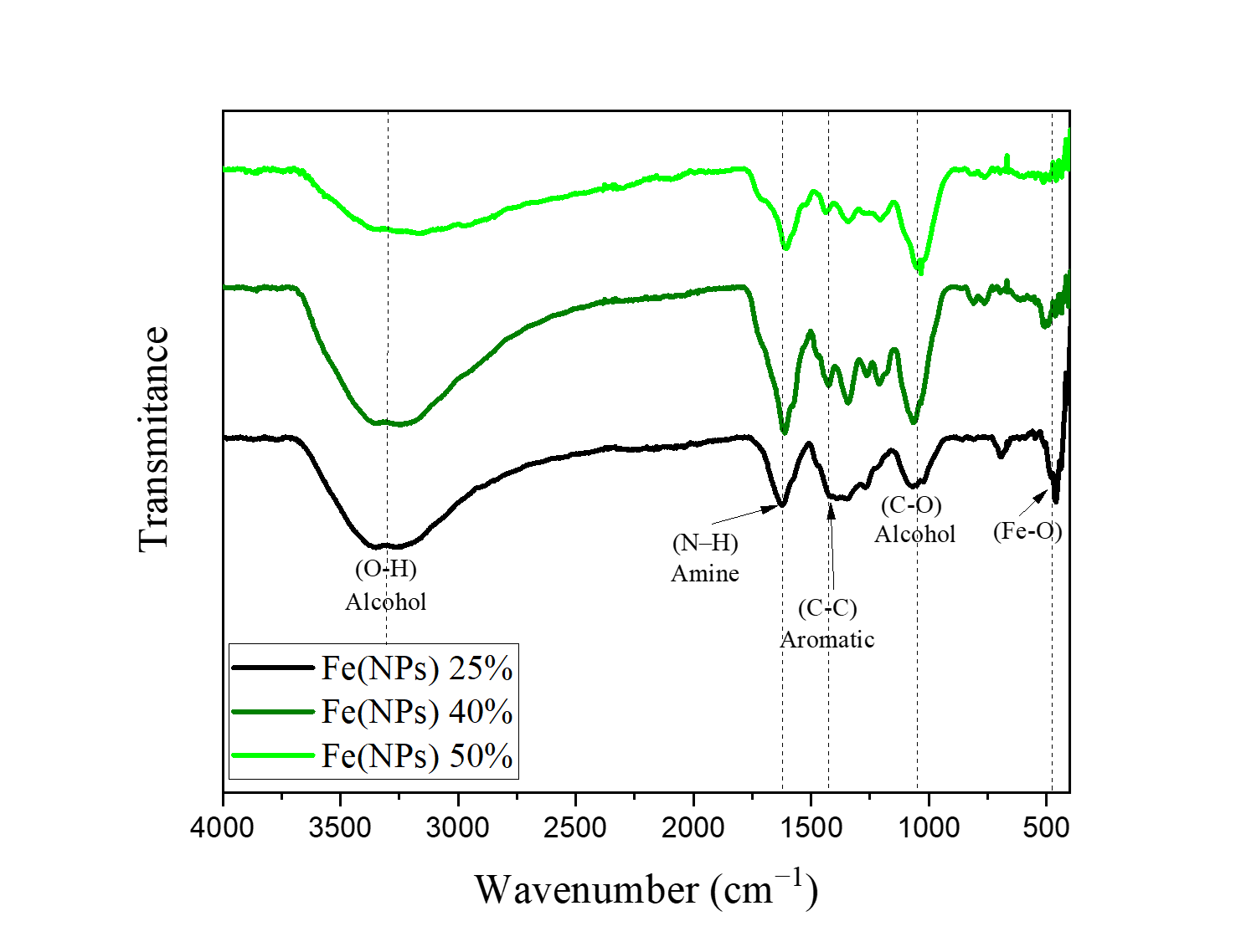 In all studies, the presence of the band associated with the Fe–O bond was observed, indicating the formation of iron oxides or hydroxides, which XRD analyses can further confirmed. An example is the Fe(NPs) 25% sample, which exhibited peaks characteristic of lepidocrocite.