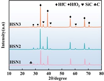 As shown in Figure 8, the porosity and bulk density data of the three composites indicate a clear correlation between the macroscopic properties of the materials and the microscopic morphological characteristics depicted in Figure 7: The HSN1 sample exhibits a dense structure (containing only a small number of microdefects) due to the homogeneous nucleation characteristics of HfC and SiC grains with small and uniformly distributed grain sizes, corresponding to its lowest porosity of 20.43% and highest bulk density of 2.33 g·cm−3; The HSN2 sample exhibits submicron-sized gaps caused by sintering shrinkage and small pores formed by the accumulation of nanowires under heterogeneous nucleation mechanisms. Although the strong capillary forces imparted by the small pores can promote precursor penetration, the additional pores still result in a significantly higher porosity and corresponding decrease in bulk density compared to HSN1. The HSN3 sample exhibited distinct cracks and pores due to continuous epitaxial growth and grain merging. The entrances to large pores were prematurely sealed due to preferential precursor deposition, weakening capillary forces, and obstructing internal penetration. Additionally, the increased size and reduced uniformity of HfC grains resulted in the highest porosity and lowest bulk density. Meanwhile, as the number of PIP cycles increases, the number of pores generated by the erosion of the PyC layer on the carbon fiber surface under Ni catalysis increases. Although the HfC-SiC composite ceramic phase can partially fill such pores, the structural degradation from HSN1 to HSN3 dominates the overall trend of continuously increasing porosity and gradually decreasing bulk density.