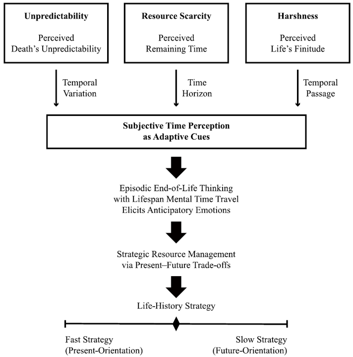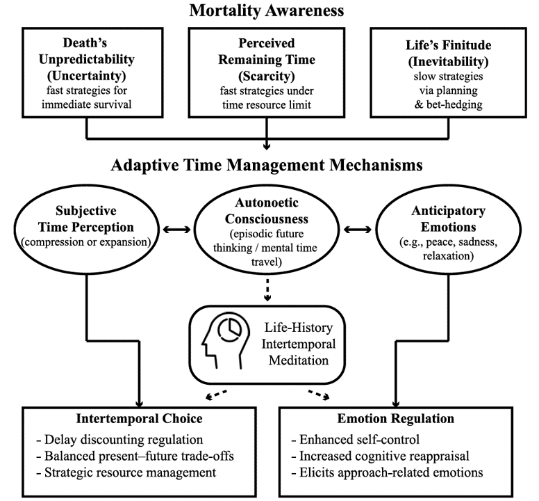 The adaptive time management framework integrates mortality awareness, mental time travel, and episodic future thinking, with their synergistic effects of shaping present–future trade-offs through time perception and anticipatory emotions. By highlighting the unpredictability of death or the finitude of life, individuals adaptively adjust their life-history strategies (varied between the fast–slow continuum), according to decision premises reflected in the mortality reminders and cues (i.e., resource scarcity, unpredictability, and harshness). The adaptive time management model emphasizes how episodic end-of-life thinking triggers anticipatory emotions that serve as informative signals for managing time and resource allocation risks.