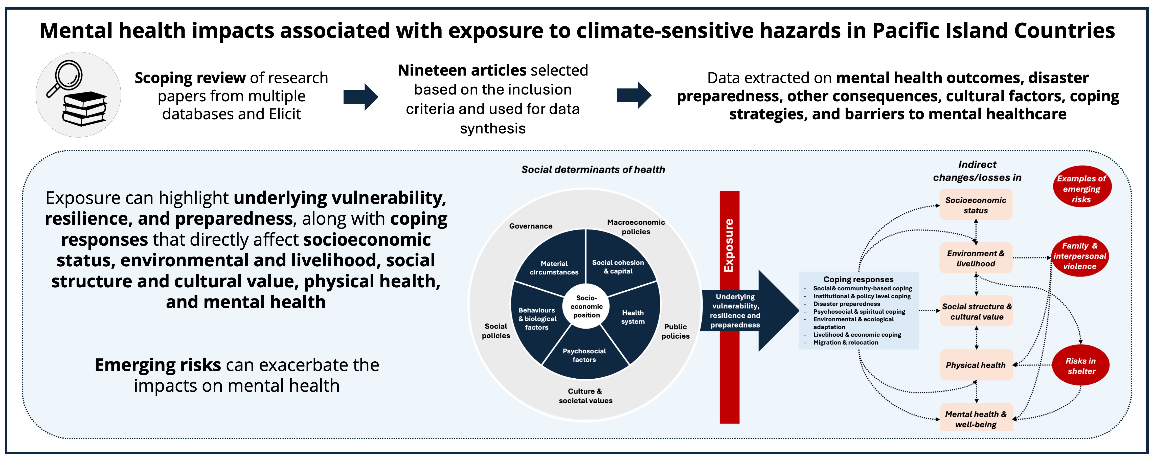 In this scoping review, we identified 19 studies that reported on climate change and mental health outcomes in PICs. Our review had three key findings. First, both acute and slow-onset events were associated with a wide range of adverse mental health outcomes, including distress, anxiety, depression, and ecological grief. However, only one study employed quantitative methods, highlighting a gap in measuring the prevalence of mental distress. Second, the relationship between climate-sensitive hazard exposures and mental health was shaped by multiple social determinants of health, including structural determinants and socioeconomic position, intermediary determinants of health, and broader socioeconomic and political context. While community cohesion and traditional support systems often contributed to resilience during disasters, limited preparedness, stigma, and lack of access to mental health services increased vulnerability. Third, climate-related events and associated coping mechanisms frequently resulted in indirect consequences that generated new risks, such as gender-based violence and risks in shelter conditions. In this section, we discuss each key finding in detail and conclude with recommendations for further study and action.