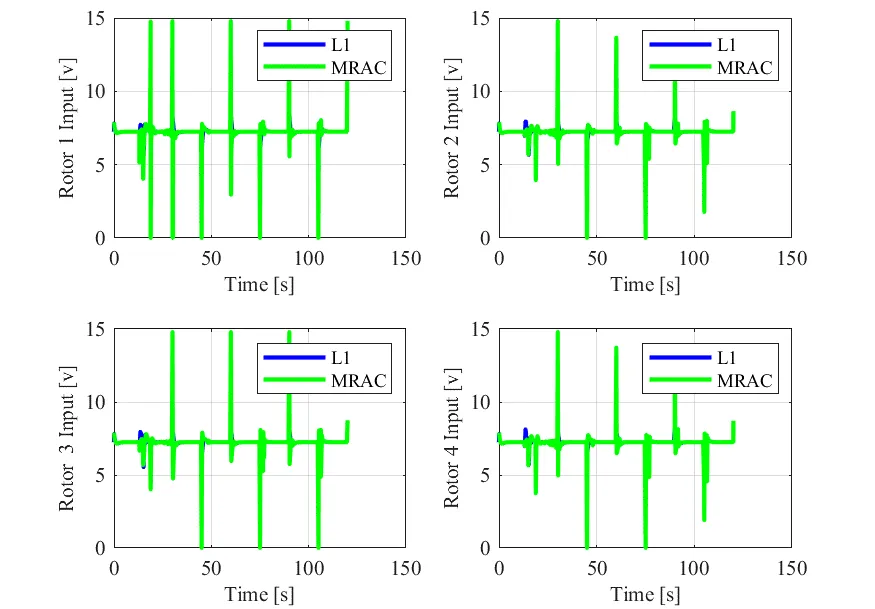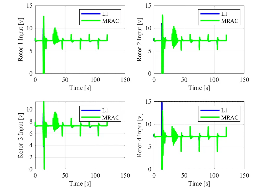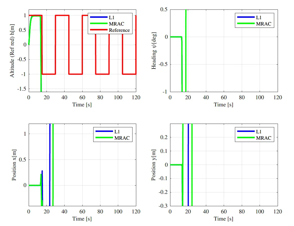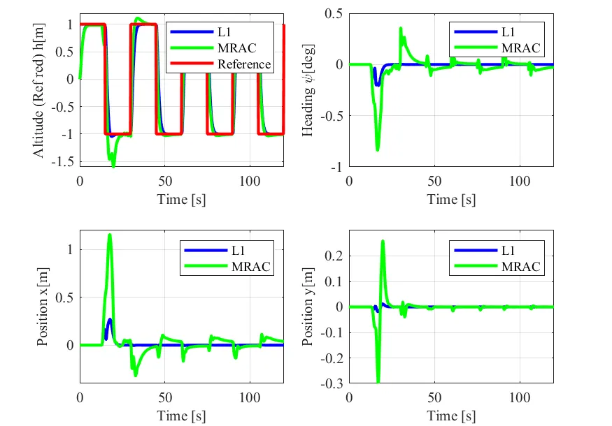 - The application of the multiple model ℒ1 adaptive controller, which involves designing an ℒ1 adaptive controller with a nominal reference model and a set of degraded reference models to handle situations where the direction of the torque produced by the propellers can be inverted.