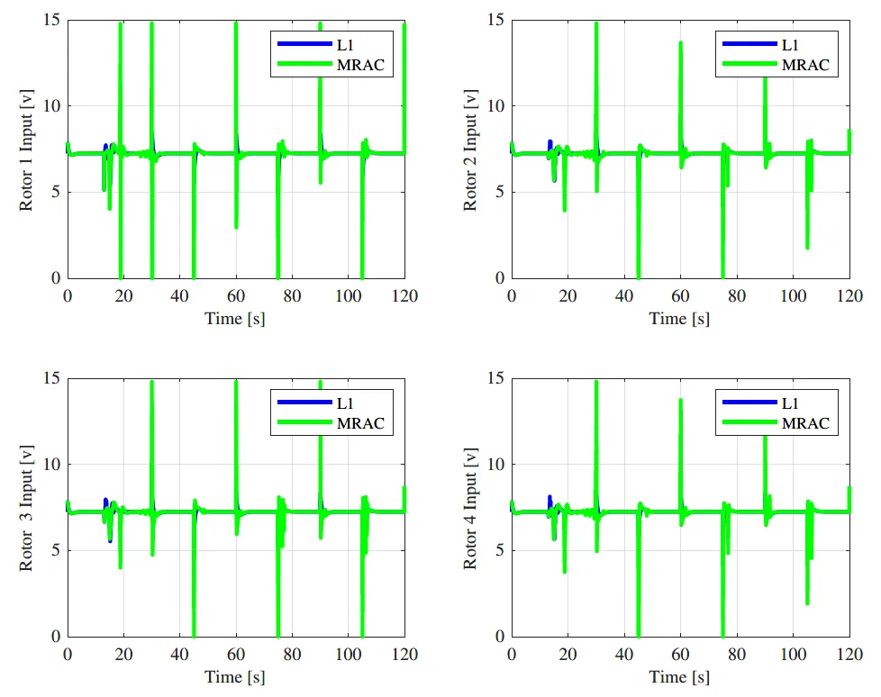 1 adaptive controller outperforms the classical controller with a single nominal model in case of inversion of the propeller torque direction.