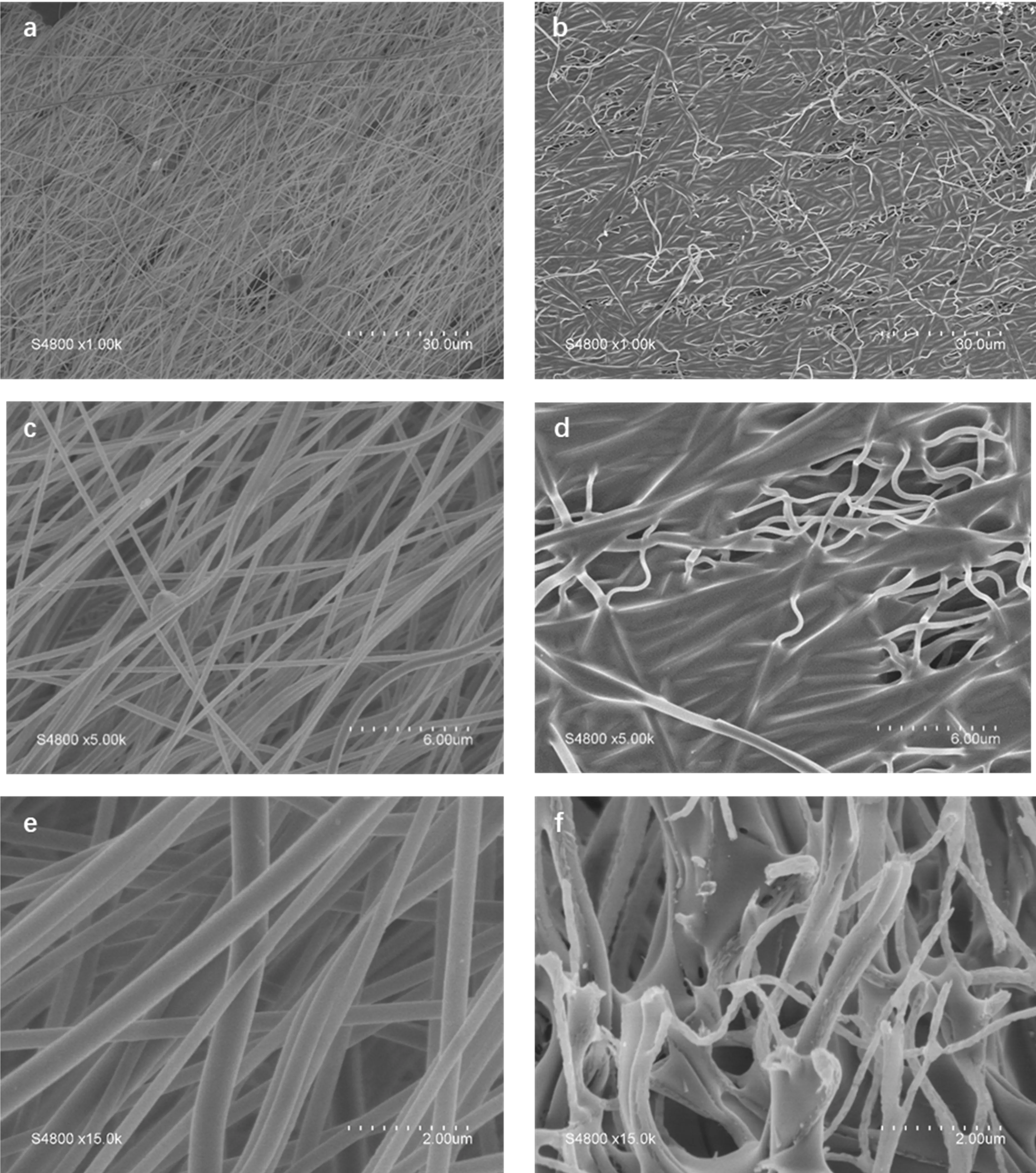 . (a,c,e) PAN fiber used as template and (b,d,f) SiC based photocatalytic material at different magnifications.
