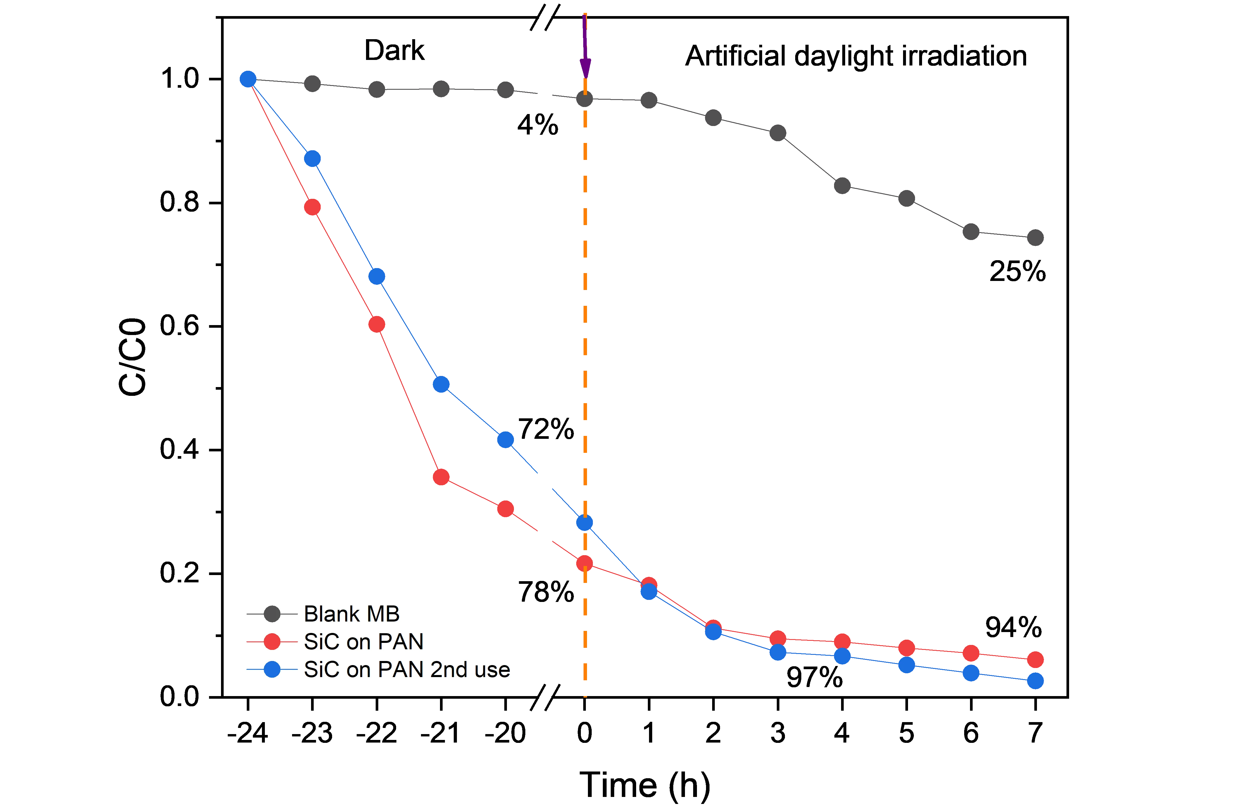 −6 mol/L, then 0.26 g of the SiC material were added. Then, they were left to stir for 4 h in dark conditions before starting the photocatalytic degradation. At the same time, a solution of MB without SiC was also kept stirring in dark as a blank experiment. An aliquot was taking every hour and then it was analyzed using a Shimadzu UV-240IPC spectrophotometer.