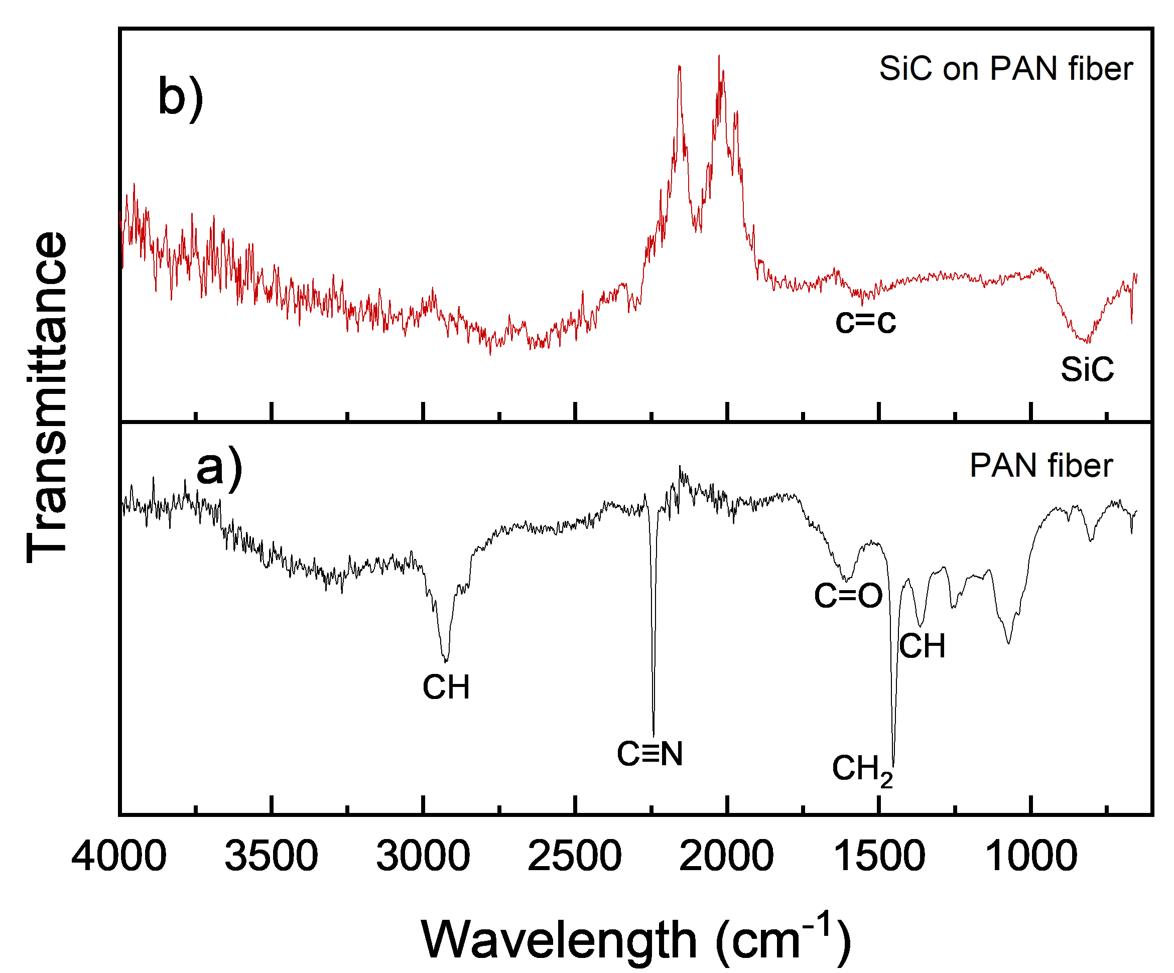 −1 (CH stretching) are characteristics of aliphatic CH groups along the PAN backbone. These peaks almost completely disappear after pyrolysis (as seen in b), and a new peak appears around 1600 cm