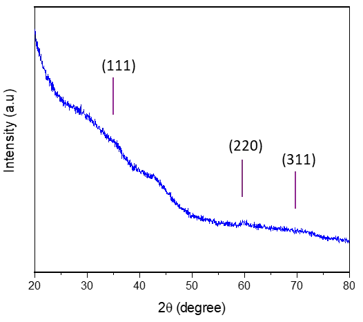 The X-ray diffraction results suggest that the prepared SiC material is amorphous, as seen in , where the XRD pattern does not show any narrow peak that implies a crystal structure, or any peak related to SiC, as we pointed out the expected positions for such peaks. One can also note that there is no strong peak at 26° that would be attributed to the 002 peak of graphite. Carbon excess is therefore likely to be in the shape of amorphous carbon.