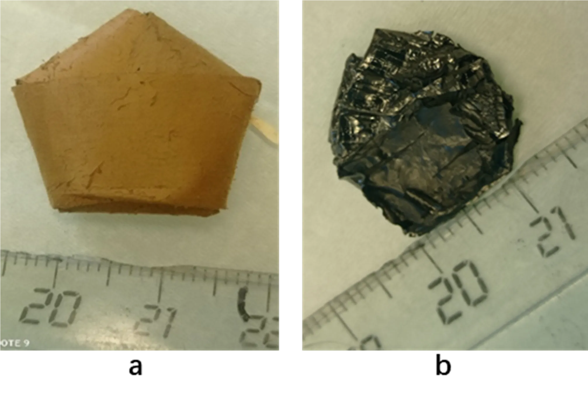. Photographs of (a) PAN fiber before SiC deposition and (b) SiC formed after pyrolysis.