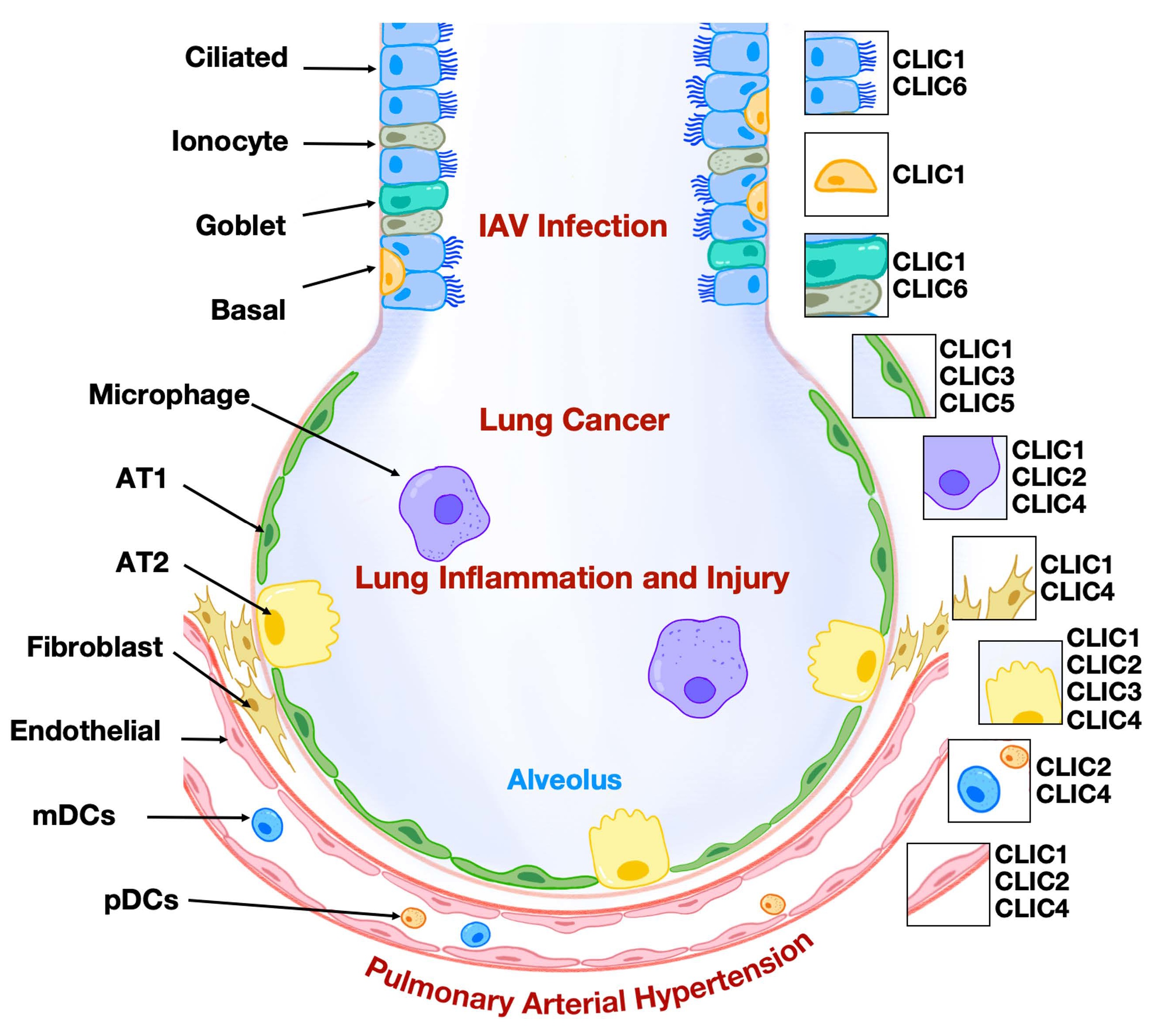 Figure 1. CLICs in lung diseases. CLICs have been implicated in the pathogenesis of various lung diseases, including lung cancer, IAV infection, lung inflammation and injury, and pulmonary arterial hypertension.