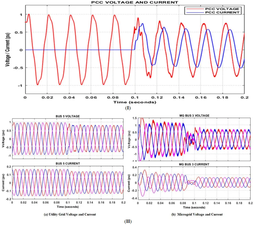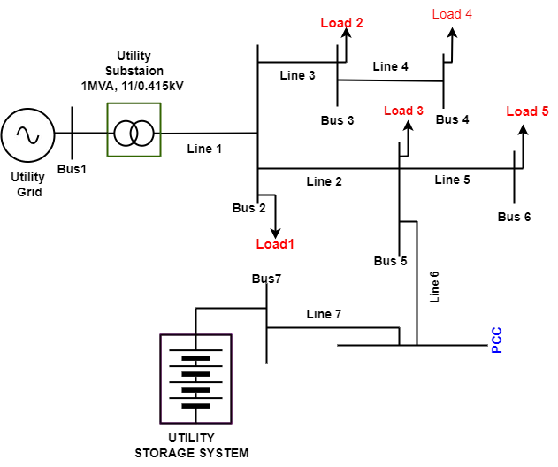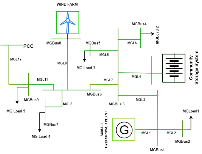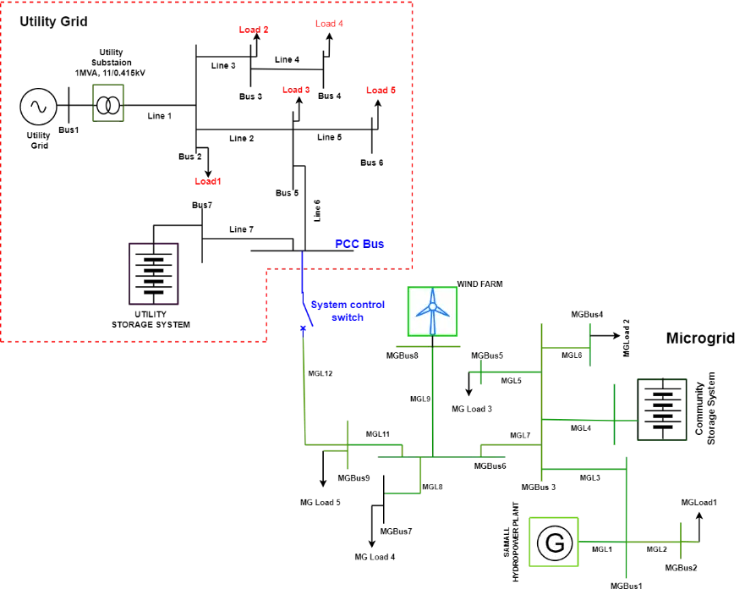 The microgrid is connected to the grid through a common point coupling (PCC). Depending on the amount of power generated and customers’ demand, excess power generated can be shared with the utility grid through PCC [