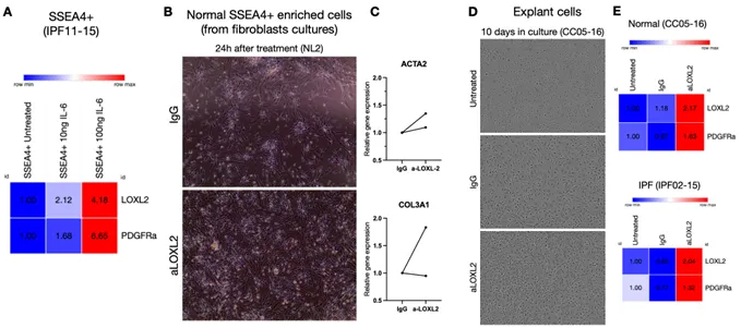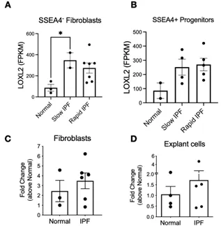 Publicly available gene expression datasets GSE24206 and GSE103488 were mined from NCBI’s geo datasets database. On GSE24206, groups were defined as follows: IPF lung biopsies vs normal lungs and IPF lung explants vs normal lungs. On GSE10348, groups were segregated from FACS sorted SSEA4