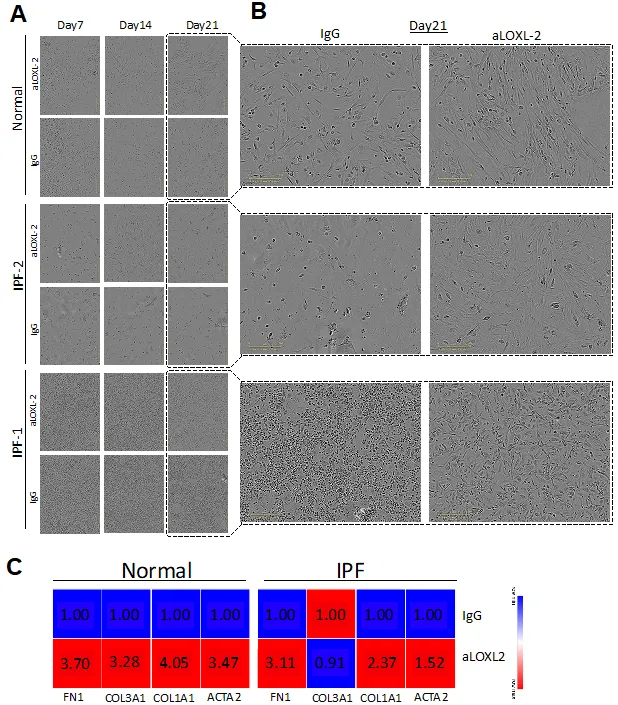 2. IgG and anti-LOXL2 treatment were replenished at every media change. Media was changed twice a week, for a total of 4 weeks. Cells were observed for mesenchymal differentiation and photographed using Incucyte Zoom system. At day 26, RNA was isolated from each treatment and pro-fibrotic genes were analyzed.