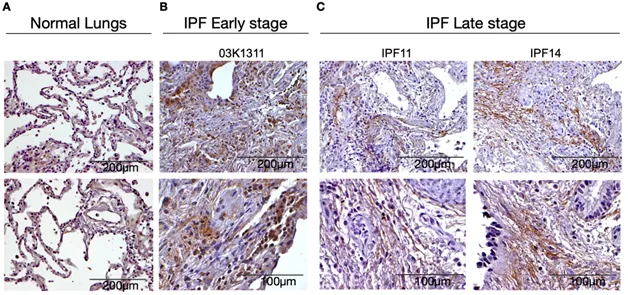 Slides containing 4 µm sections of IPF human lung biopsies or explants were deparaffinized and hydrated by incubating them twice in xylene for five min each, followed by 2 changes of 100% ethanol for 3 min each, 70% ethanol for 2 min, 50% ethanol for 2 min, and distilled water for 5 min. Antigen retrieval was performed by incubating the slides in 10 mM citric acid solution (pH 6.0) in an 80 °C oven overnight. The slides were then washed in PBS and permeabilized in 10% methanol containing 0.4% H