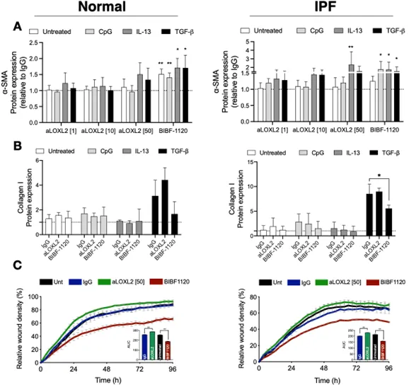 4/well) were plated into a 96 well plate and incubated overnight. After incubation, cells were treated with anti-LOXL2 (1, 10, and 50 μg/mL, GS-6624, Gilead Sciences), BIBF1120 (300 nM) or IgG in the absence or presence of CpG (10 nM), IL-13 (10 ng/mL) or TGF-β (20 ng/mL) for 24 for αSMA expression or 7 days for Collagen 1 assessment. After stimulation, conditioned supernatants were collected, and the cells were washed and fixed with 4% paraformaldehyde solution in PBS for 10 min at room temperature.