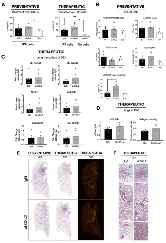 2 and prior to intravenous injection into NSG mice, these cells were thawed, washed in serum-free medium, and suspended in a volume of 0.5 mL. Treatments with either IgG (AB005123, GS645864, Gilead Sciences) or anti-LOXL2 (AB0023, GS607601, Gilead Sciences) mAb from day 0–35 (i.e., preventative regimen) or from day 35–63 (i.e., therapeutic regimen) after intravenous injection of IPF lung cells. Sixty-three days after IPF cell injection and IgG or anti-LOXL2 mAb treatment, the superior and middle lobes were collected for biochemical hydroxyproline quantification, the post-caval lobe for qPCR analysis, and the left lung for histological analysis from each mouse.
