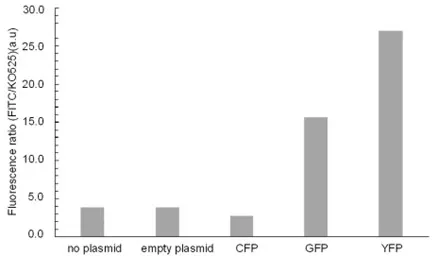 . Ratio of fluorescence signals in FITC to KO channels for GFP and its variants CFP and YFP. YFP contains two mutations – S65T and T203Y while CFP contains three mutations—N146I, S175G and H231L.