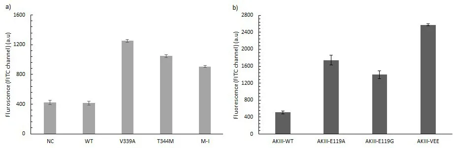 b) The significant difference between various mutants of AKIII from the QUEEN fluorescent signal. There is significant difference between the wildtype and the mutants V339A [