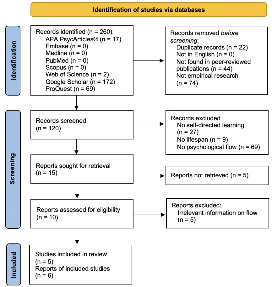 Csikszentmihalyi’s psychological flow and self-directed learning have a well-researched and direct connection. Lacking is an investigation of this relationship across the lifespan—the aim of this review. A search of seven primary databases and one supplementary database (searched eight different ways) with the keywords “self-directed learning, lifespan, psychological flow”—for English-language empirical research studies in peer-reviewed publications—provides this assessment of recent publications with high recall and high precision. The hypothesis is that distinct topics are recognizable, concerning the relationships among self-directed learning, lifespan, and psychological flow, regarding how self-directed learning promotes psychological flow throughout the lifespan. As a quasi-scoping review, the standardized PRISMA-ScR is the methodology. The supplementary database search, without Boolean functions, and yielding the highest returns, produced the five results included. Corroborating the hypothesis, three Csikszentmihalyi-inspired topics synthesize the results: (1) feeling better in the moment, (2) body and mind are in harmony, and (3) improving the quality of life. Based on the synthesis, the level of meaning the learner ascribes to their work determines the relationship among the three keywords. The conclusion is that the relevance of flow to self-directed learning throughout the lifespan depends on learner engagement in supporting their work-related purpose and meaning regarding the learning material.